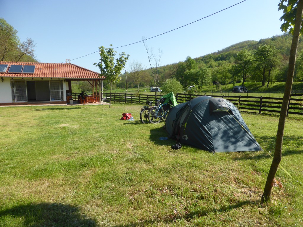 Die Abfahrt war leider viel zu kurz für den langen Anstieg, aber trotzdem sehr schön, wir hatten eine weiterhin wunderbare Aussicht auf die Donauschlucht. Und kaum waren wir unten, waren wir schon in unserem heutgen Zielort Tekija (wird übrigens auf der ersten Silbe betont, nicht wie Tequila). Wir hatten gelesen, dass es hier einen Stadtstrand gibt, wo man auch zelten darf. Es war eher Flusskiesel als Strand, aber ein guter Platz für uns mit unserem Zelt direkt an der Donau.