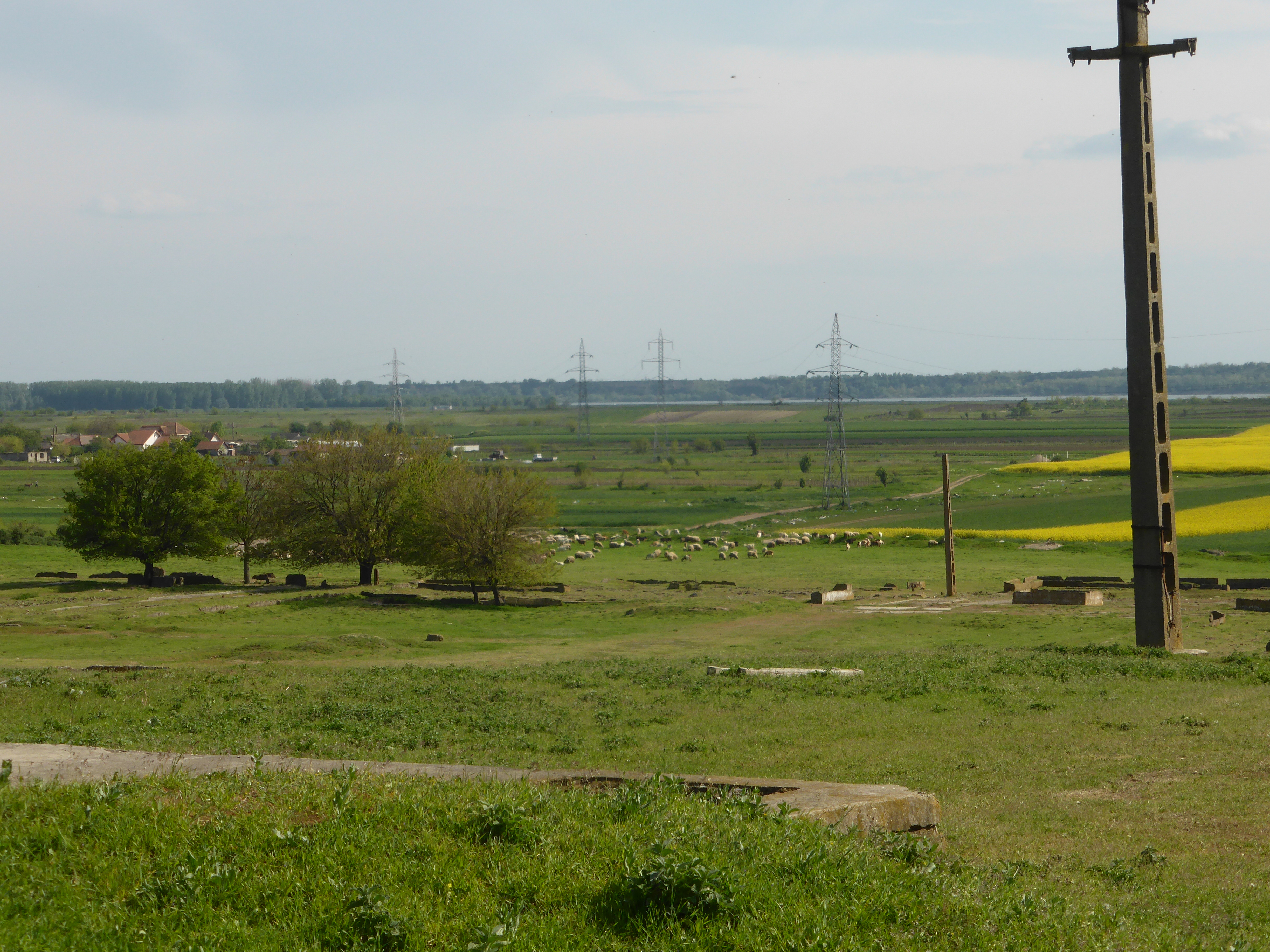Hier in Rumänien saßen heute immer wieder Menschen auf Bänken vor ihren Häusern und freuten sich meist sehr, wenn wir sie vom Fahrrad grüßten. Die Dörfer haben meist noch einen kleinen Krämerladen, das „Magazin“, wo oft auch ein paar Leute sitzen und ggf. schon das erste oder zweite Bier trinken. Ansonsten ist uns aufgefallen, dass es immer einen kleinen Marktplatz mit festen, oft auch überdachten Tischen gibt, wo vermutlich erst, wenn es regional auch was zu ernten gibt, eingekauft werden kann. Die Orte haben auch ansonsten schon ein ganz anderes Erscheinungsbild als die in Westeuropa, die Gebäude sind meist kleiner und annähernd überall stehen Obstbäume. Dazu kommen immer wieder Baustellen für große, prunkvollere Gebäude mit meist zwei Stockwerken, einige sind schon länger verwaist, auf anderen wird fleißig gearbeitet. Am Ende des Tages sahen wir auch einige dieser Häuser im fertigen Zustand und kamen zum Schluss, dass dort mehrere Generationen mindestens einer Familie zusammen leben.
