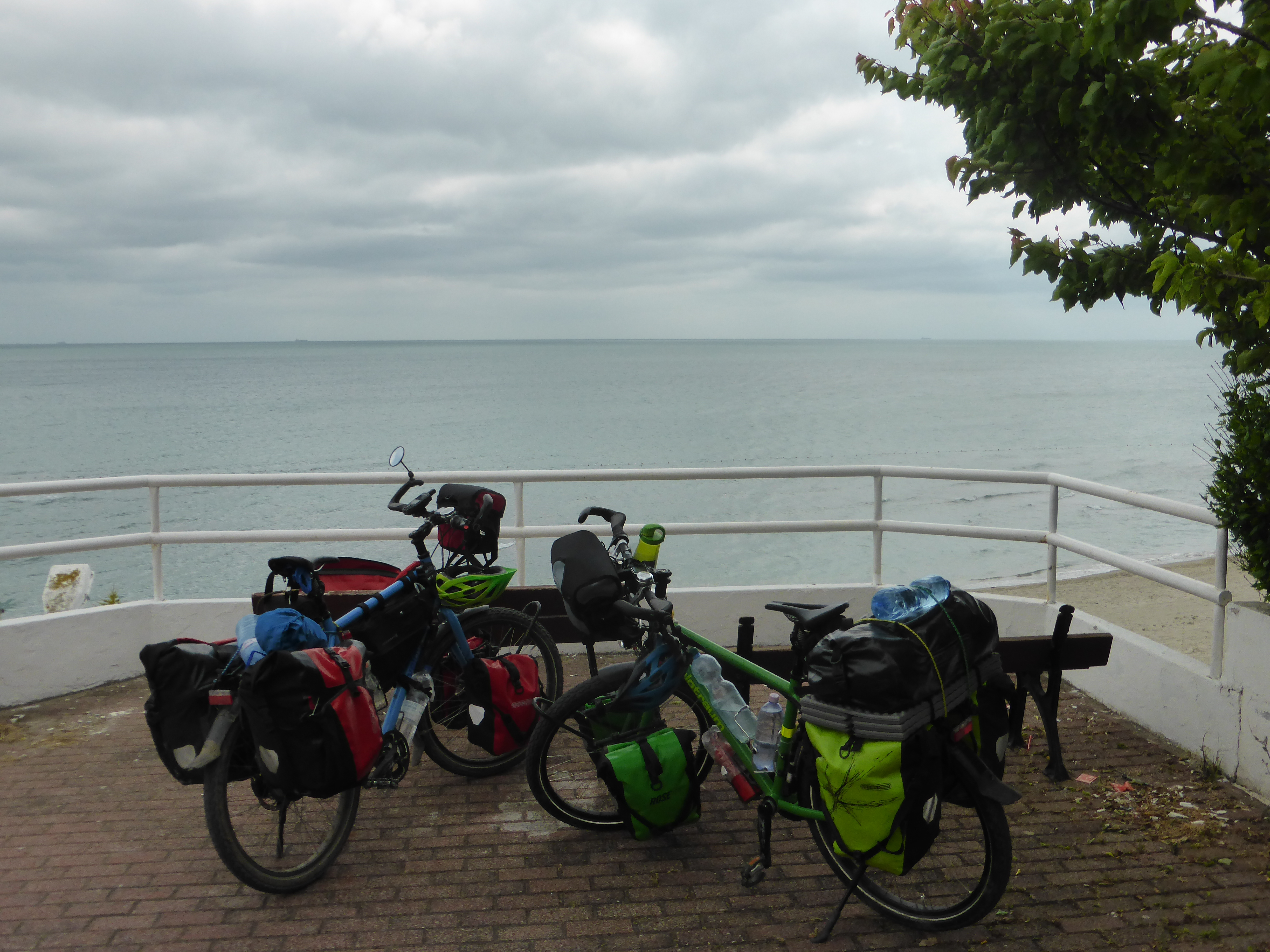 Wir fuhren am Meer entlang und machten auf einer Bank mit Meerblick zwischen den Ferienhaussiedlungen Mittagspause und fuhren dann weiter irgendwo zwischen großer Straße, Ferienhäusern und Meer bis zu unserem Hotel (mit Frühstück!). Als wir um ca. 19 Uhr etwas zu Abendessen suchten, gab es vereinzelte hupende Autos mit Türkeiflaggen, die auf der großen Straße neben dem Hotel fuhren. Das wurden immer mehr und bis spät abends war die Straße voll mit hupenden Autos und Sattelzugmaschinen mit Türkei- und Erdoğan-Flaggen in allen Größen.
