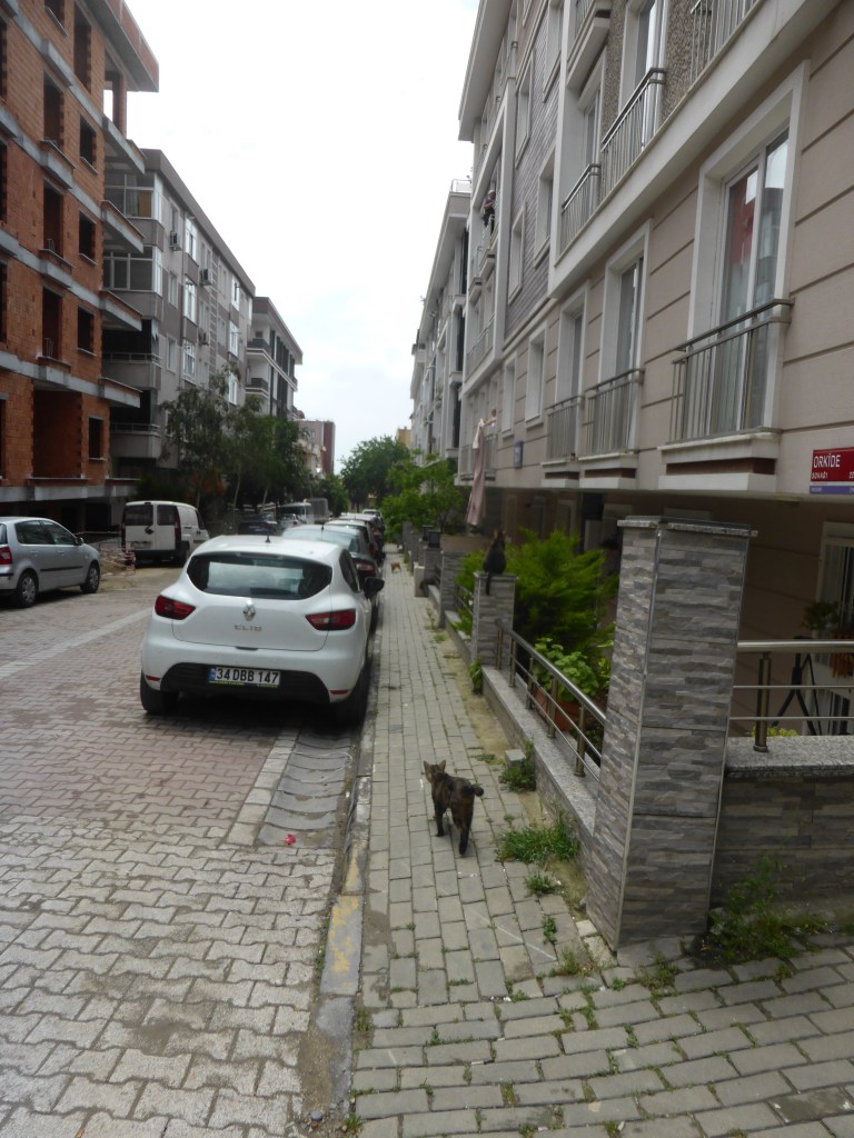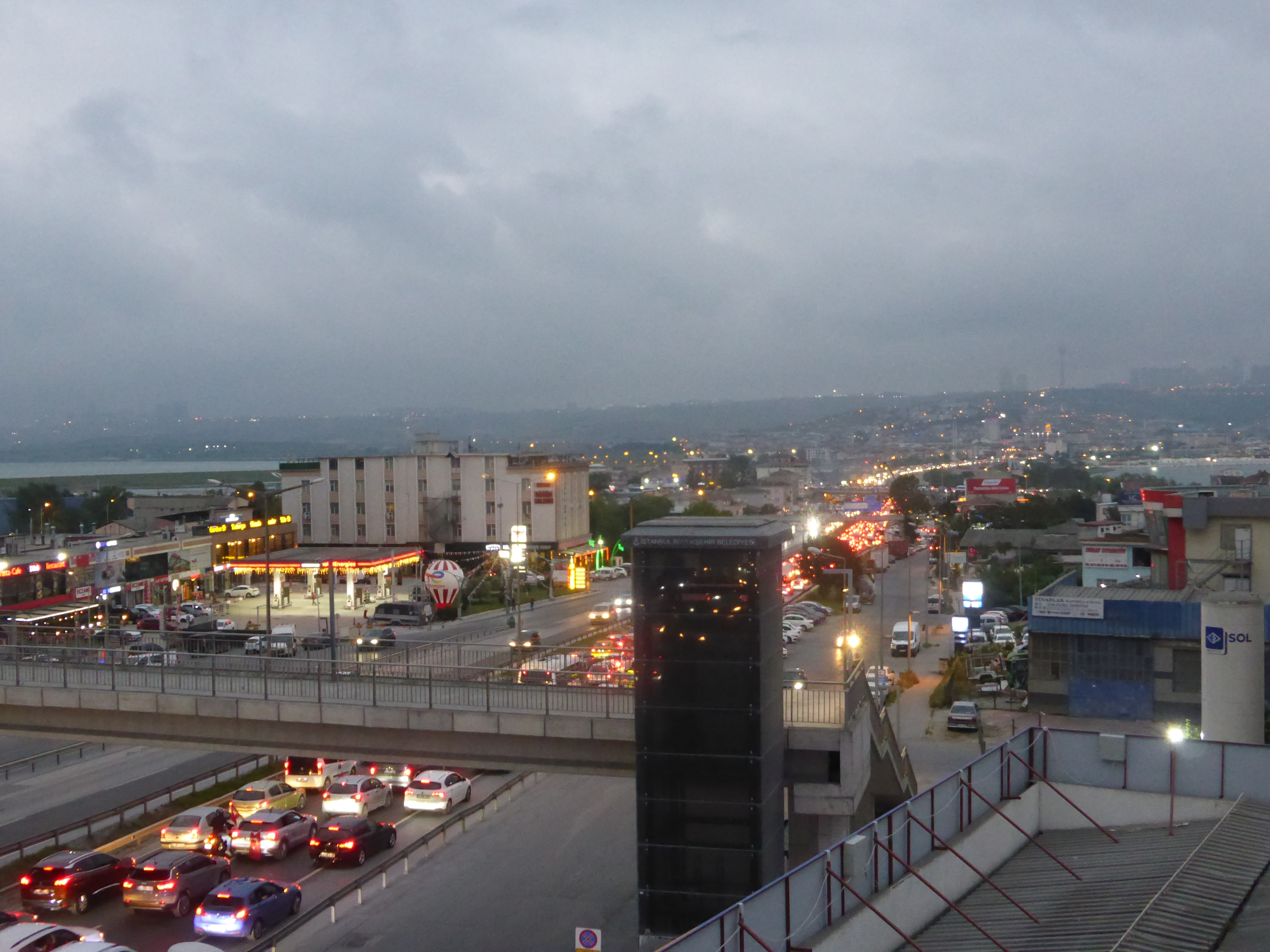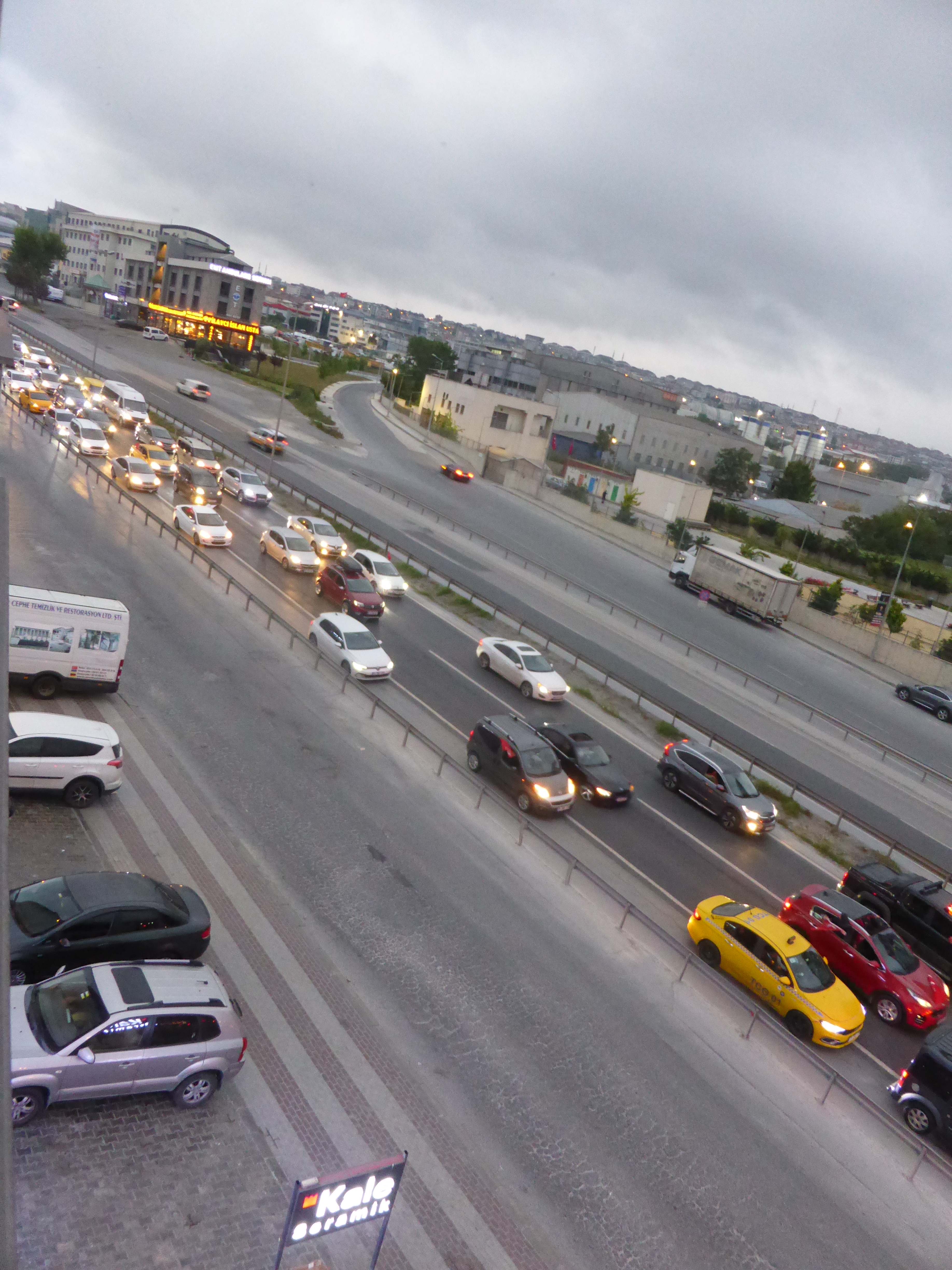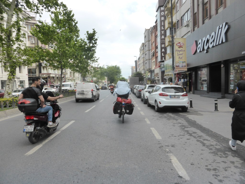 Am 29.5.23 stärkten wir uns reichlich beim Frühstücksbuffet, denn wir wussten, wir hatten heute einiges vor. Zwar nur ca. 50 km, aber 900 Höhenmeter und viele Menschen erwarteten uns. Die Frage war immer wieder: Auf dem Randstreifen der großen Straße mit all den Autos, LKWs und Bussen, dafür flacher fahren ODER kleine wenig befahrene Nebenstraßen in der Vorstadt nehmen, die wahrscheinlich steiler bergauf und bergab verlaufen? Nach dem zweiten Anstieg mit ca. 17 % Steigung in einem Wohnviertel dachten wir, die Hauptstraße ist doch gar nicht soo schlecht… Aber Simon, das Navi und komoot fanden immer wieder andere Straßen durch schöne Wohnviertel, einen Containerhafen, an Spielplätzen vorbei, durch das Näherei-Viertel, volle Straßen bergauf, volle Straßen bergab, Einbahnstraßen und so weiter. Außer Fahrradwegen war wohl alles dabei 😉 Der Verkehr in Istanbul war angenehmer als befürchtet, die Kraftfahrzeugführer*innen geben sehr viel Acht aufeinander, vor allem auf Radfahrende. Viele überholen mit viel Abstand und auch wenn es eng wurde, ließen sie uns mit den Fahrrädern passieren. Ein Autofahrer feuerte uns an einem Hügel freundlich lachend an, sodass er nach uns auf die Straße fahren konnte. Istanbul wird ja die Stadt auf den sieben Hügeln genannt, und durch das Reinfahren mit dem Fahrrad kann man das wirklich miterleben! Auf unserem Weg hinein fand ich es sehr beeindruckend, wie wir einige Male Hügel hinauf geradelt sind und sich von dort oben wieder ein neues Bild voller neuer, anderer Häuser ergab!