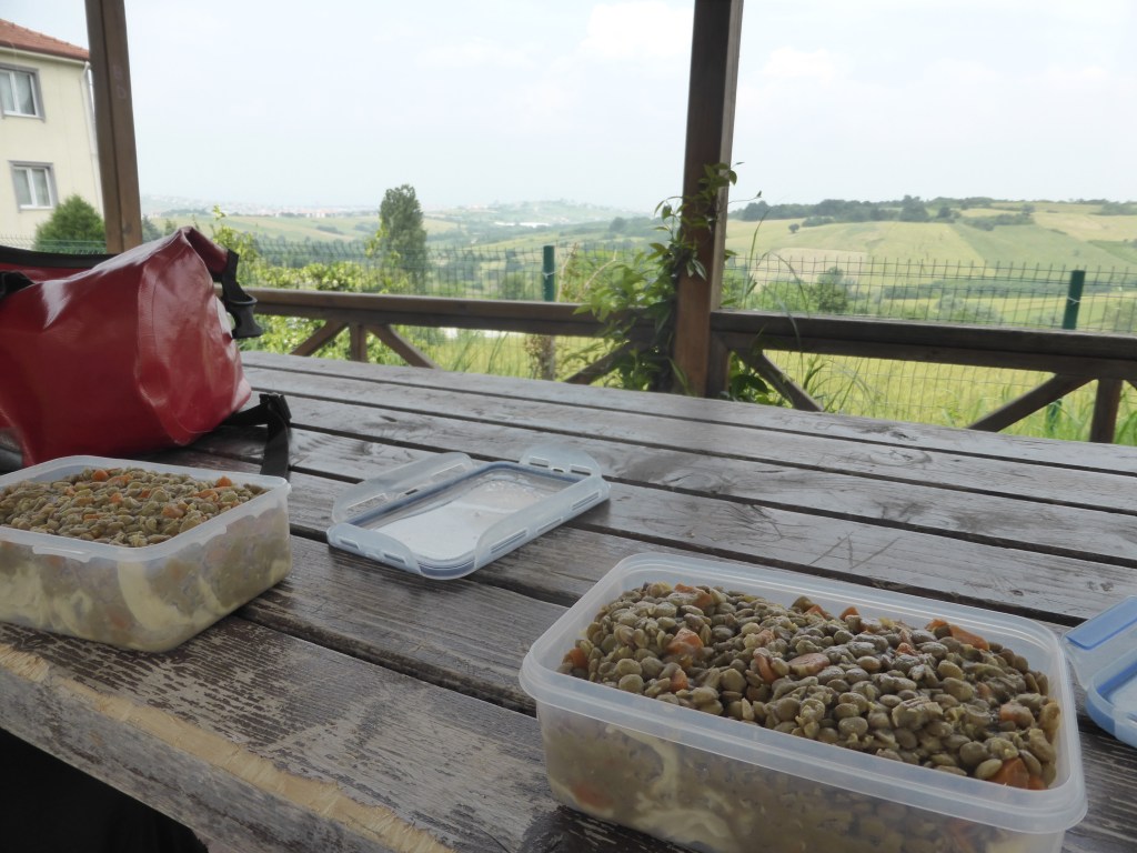 Es ging auf kleinen Straßen von Dorf zu Dorf, bis wir in einer kleinen Stadt nahe der Innenstadt eine Bank zum Pause machen fanden. Dort schenkte uns eine Frau, die an uns vorbeilief, frische, selbst gebackene Brötchen, wir freuten uns sehr darüber! Nach der Pause ging es auf der großen Straße weiter bis Çorlu. Die Straße nach Çorlu rein wurde immer voller mit Autos und Kleinbussen, aber wir fanden einen schönen Weg in die Stadt an vielen Imbissen vorbei. Unser Host ist Arzt und arbeitet in einer Blutspende-Station. Da er bis 19 Uhr arbeiten musste, nutzten wir die Chance, Linsen mit Spätzle zu kochen. Er fand es wohl lecker, denn er hat sich die Reste als Mittagessen für den nächsten Tag eingepackt 🙂 Wir haben noch den ganzen Abend mit ihm über die Türkei, Deutschland und Turkmenistan, sein Heimatland geredet. Er berichtete uns, dass viele seiner jungen Kolleg*innen in der Türkei deutsch lernen, um vielleicht in Deutschland arbeiten zu können, da in Deutschland Ärzt*innen gesucht werden…