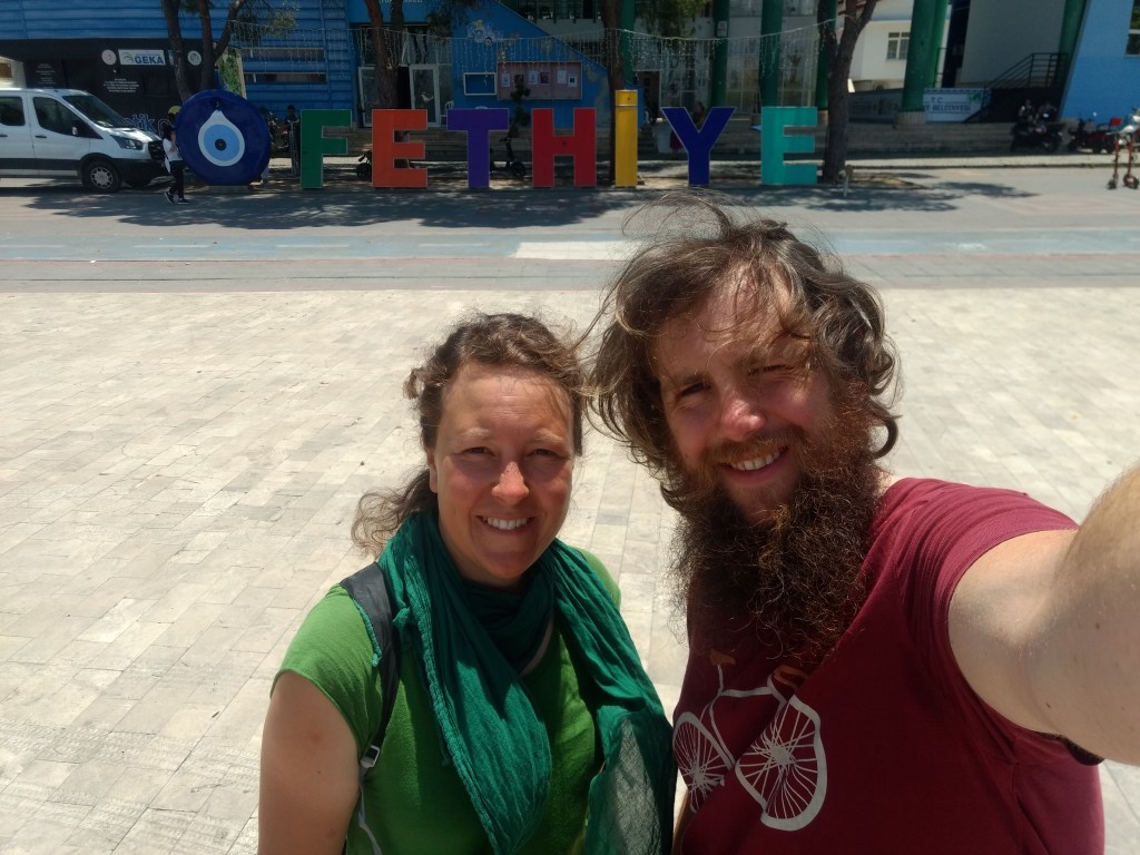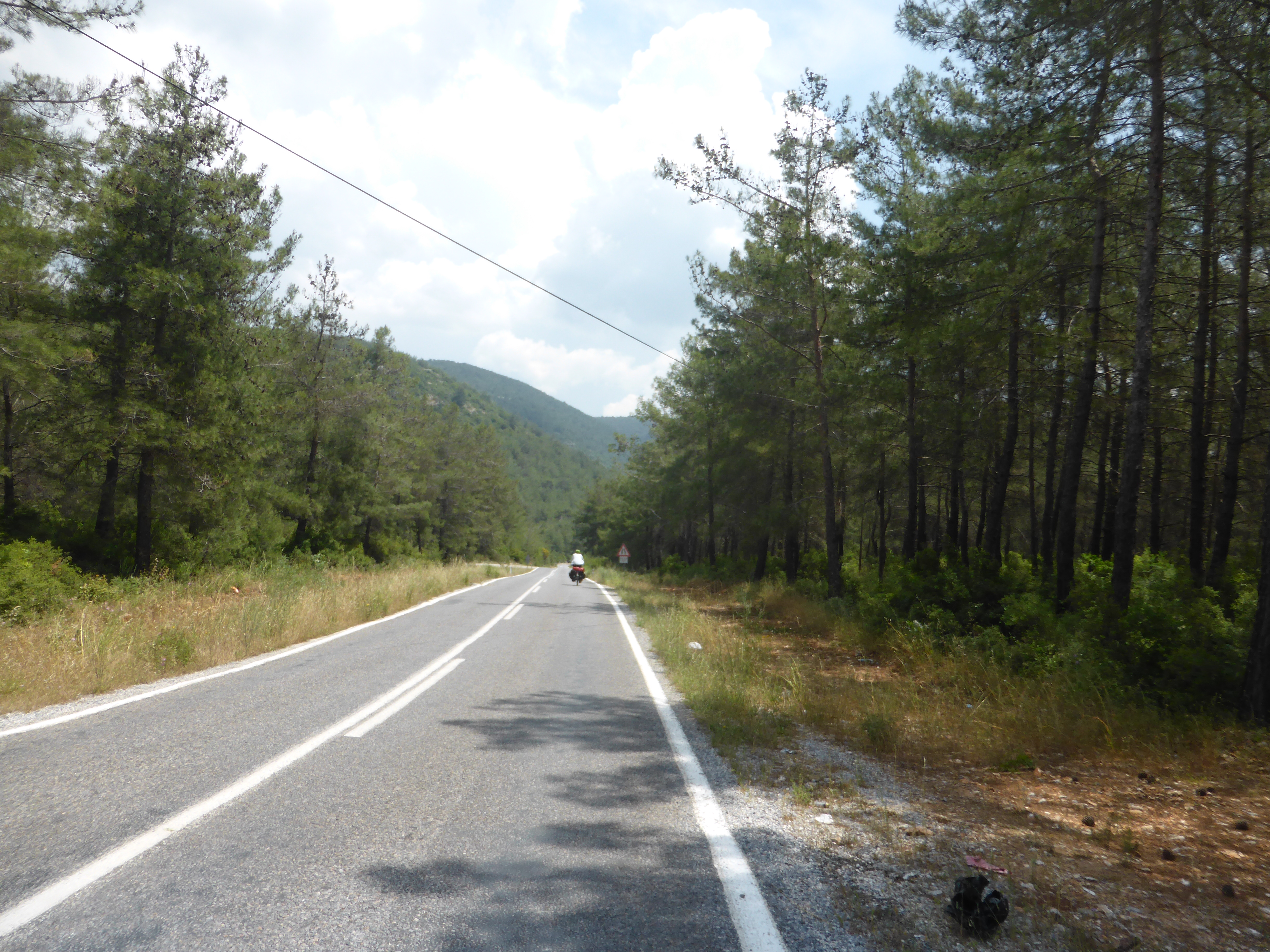Nach ca. 30 Minuten waren wir drüben und kamen direkt in ein kleines Touri-Städtchen, wir kauften neue Vorräte und machten etwas Pause im Park. Da wir von den vergangen Tagen relativ geschafft waren, überlegten wir uns, dass wir in Fethiye oder einer der danach kommenden Städte für zwei Nächte bleiben könnten, um uns etwas zu erholen. Das einzige Problem an dem Plan mit Fethiye war, dass es mittlerweile schon Mittag war und die Stadt laut Navi noch ca. 70 Kilometer und knapp 1000 Höhenmeter mit einigen Steigungen von knapp 10 Prozent entfernt war. Mist… die Strecken auf zwei Tage aufzuteilen, schien auch nicht so ganz richtig, also schoben wir die Entscheidung noch auf und fuhren weiter. Es ging wie erwartet immer wieder hoch und runter, es hatte selbstverständlich auch 30 Grad im Schatten und über dem Asphalt entsprechend mehr. Als wir 50 Kilometer und den höchsten der Hügel mit 430 Höhenmetern geschafft hatten, entschieden wir, dass es machbar ist, bis zum Hotel zu fahren und buchten und ein Zimmer.