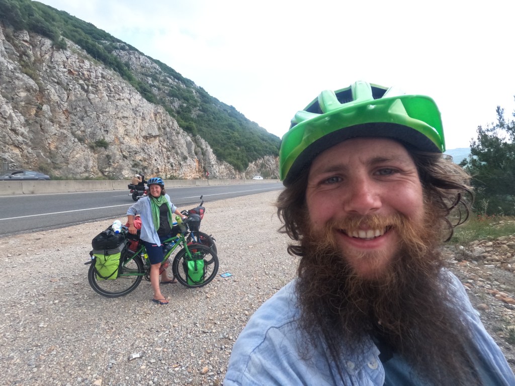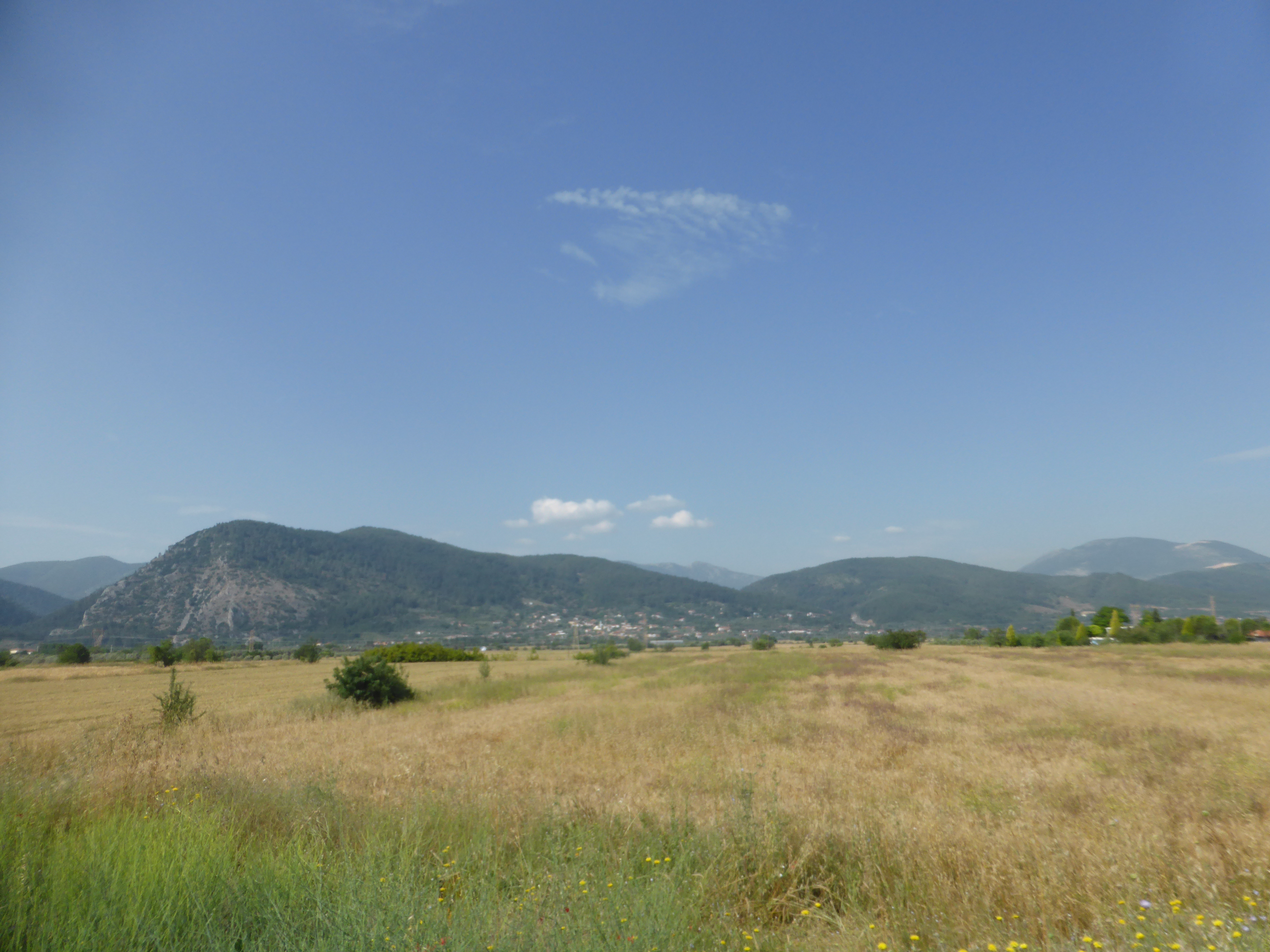 Wir hatten uns den Wecker auf 5 Uhr gestellt, weil die Sonne so früh aufgeht und es sonst im Zelt zu warm wird. Naja, wir stehen nicht sofort auf, frühstückten dann im Zelt, packten alles wieder zusammen, verabschiedeten uns von der Bäuerin und fuhren weiter durch die Berge. Zuerst ein kurzes Stück bergab und dann wieder weiter den Berg hinauf. Dann ging es eine Weile durch die Hochebene mit Olivenhainen und Getreidefeldern.