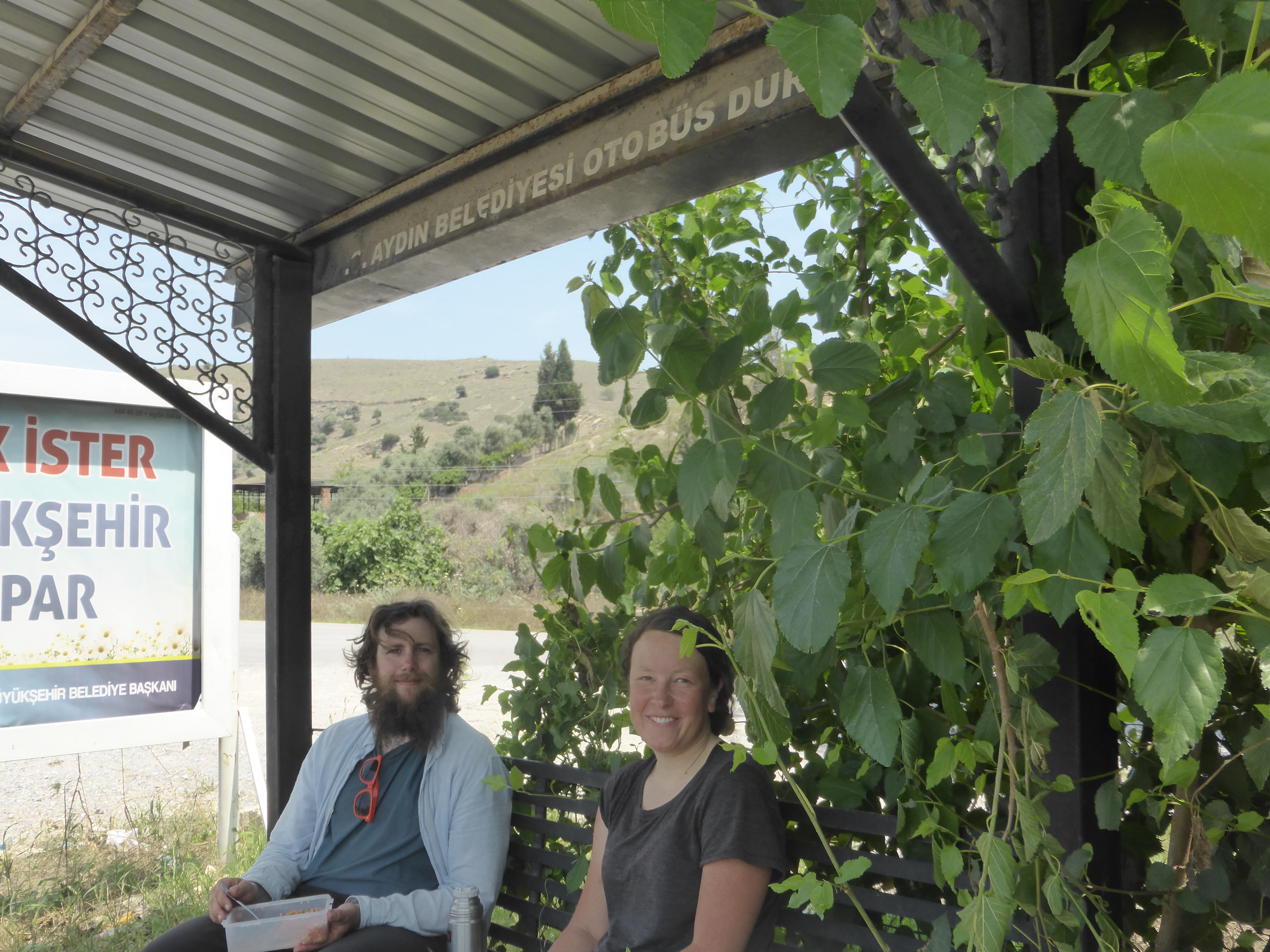 Nachmittags kamen wir in der Stadt Aydin an, kauften uns Obst und machten Mitttagspause im Park im Schatten. Gerade als wir wieder los wollten, lud uns eine Gruppe junger Männer auf einen Çay ein und wir unterhielten uns per Übersetzer auf dem Handy. Sie fragten, wie wir die Türkei finden und ob die Menschen nett zu uns seien. Na klar, so wie wir hier immer wieder auf Tee und Gespräche eingeladen werden! Die Männer mussten auch weiter und so ging es für uns noch einige Höhenmeter hinauf, um am besten bei guter Aussicht zelten zu können. Auf 400 Meter war die Aussicht wirklich schön, aber leider gab es keinen Schlafplatz für uns.