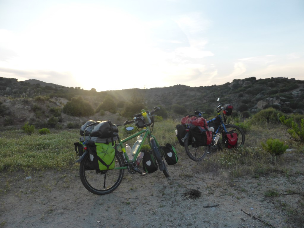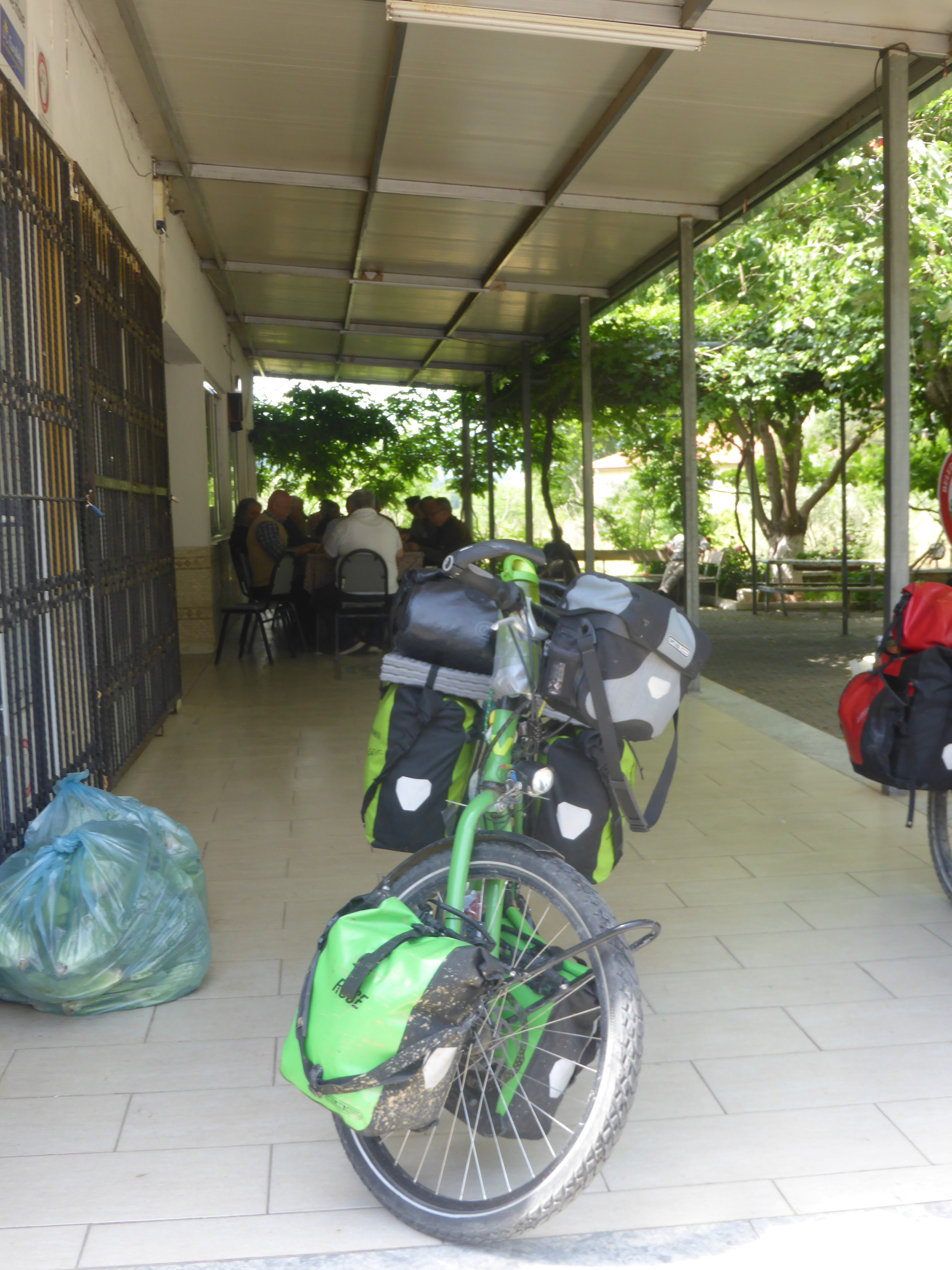 Wir wurden hier mit Tee begrüßt, bekamen alles gezeigt und freuten uns erstmal über die Dusche. Danach gingen wir mit dem Koordinator der Radwege in ein Dorfrestaurant, wo es nur lokales Essen gab: Gegrillte Kartoffeln, Tomaten, Auberginen und scharfe Paprika und gebratenes Rindfleisch, dazu hausgemachtes Brot und Oliven. Wir genossen das Essen sehr und redeten mit ihm über Radwege und Radreisen. Später bekamen wir noch Gurken, Tomaten und Paprika fürs Frühstück.