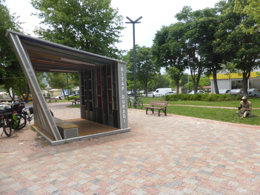 Mittags kamen wir in Muğla an, wo wir wieder mal im Park im Schatten Pause machten. Da zogen Wolken auf und wir setzten uns in eine Büchertauschhütte und warteten ein bisschen den Regen ab.