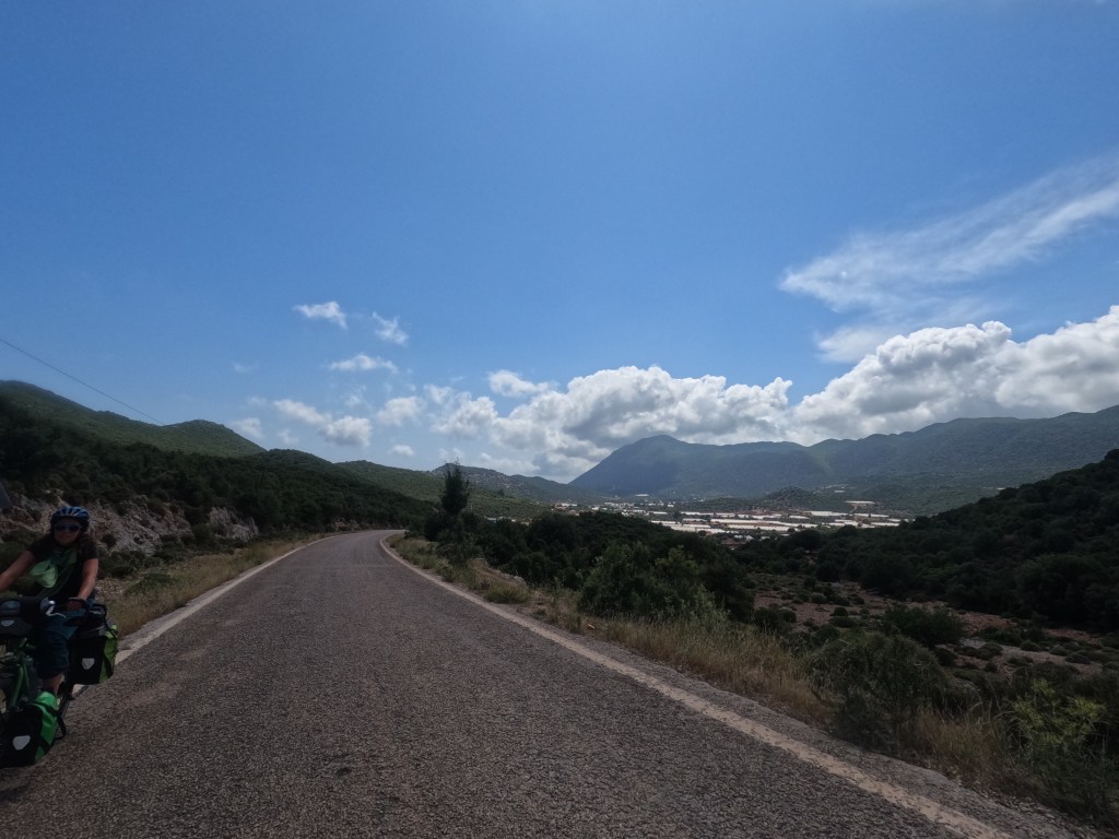 Der Campingplatz lag fast direkt am Meer und vom Zelt aus konnten wir schon den Anstieg sehen, den wir heute am 17. Juni 2023 erklimmen durften. Also fuhren wir mit allem los und hinauf. Zum Glück war es heute etwas bewölkt, also war es etwas kühler. Auf etwa 50 Höhenmetern sahen wir eine Hündin neben Autos liegen, die sich kurzerhand entschloss, uns zu begleiten. Sie rannte neben uns her und später ging sie ganz gemütlich den Berg hinauf und wartete immer wieder auf uns, so als wären wir ihr viel zu langsam.