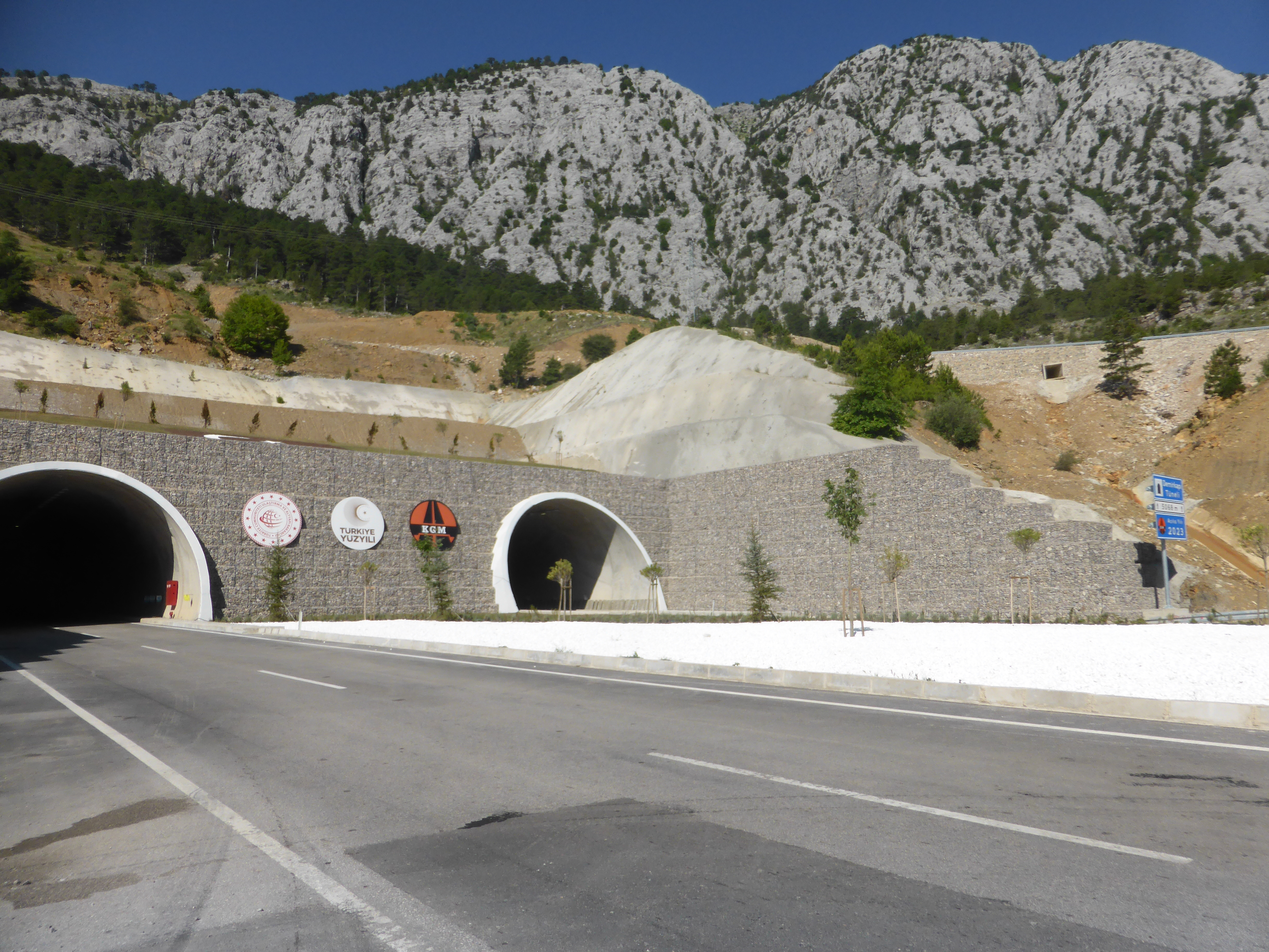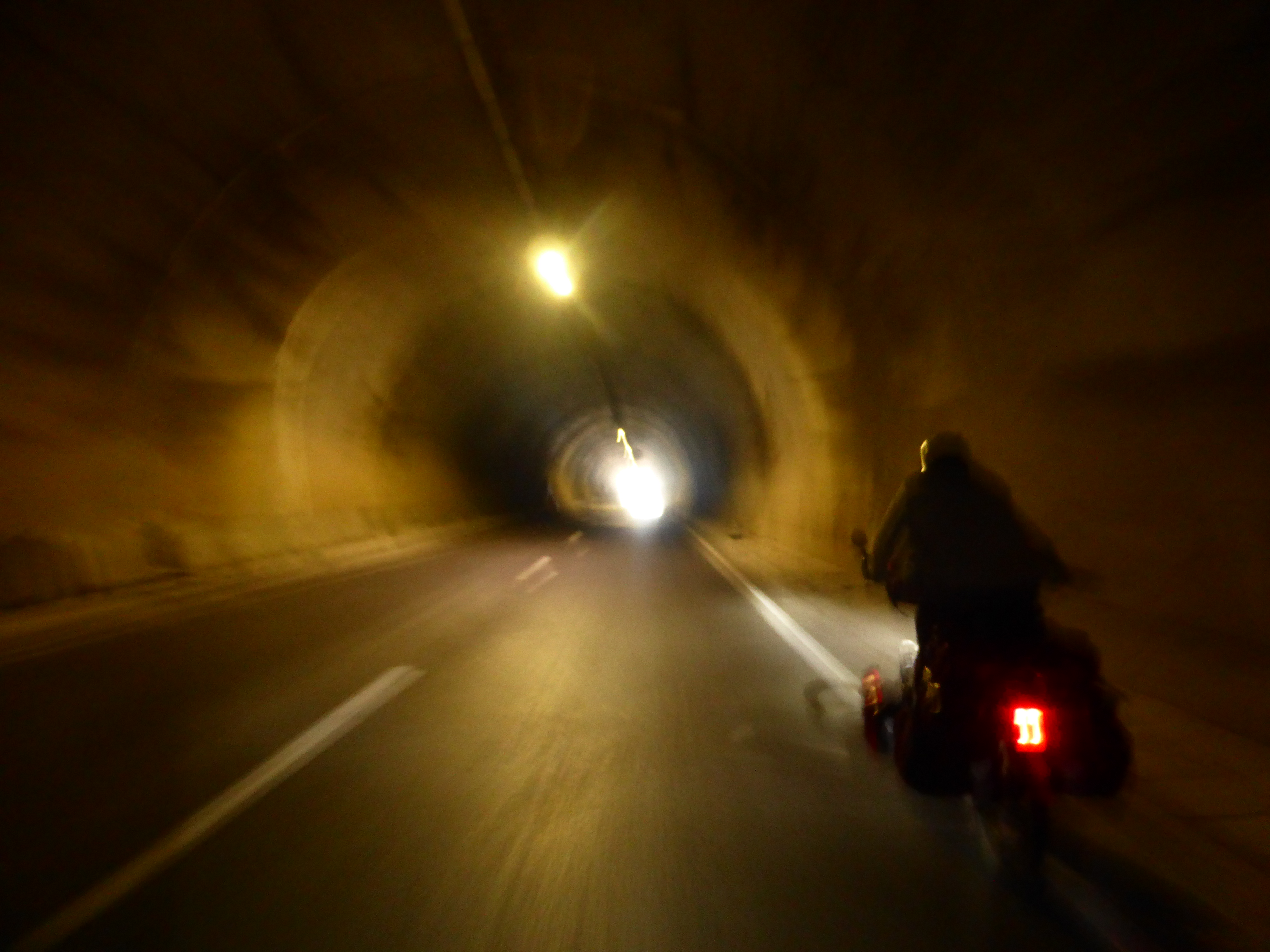 In der Nacht wachten wir auf, weil in der Ferne ein Esel anfing zu rufen, dann hörten wir ihn laufen und er kam immer näher. Nach kurzer Zeit war er bei uns angekommen, hatte sich aber scheinbar etwas beruhigt und fraß nun um unser Zelt herum, wir hörten wie er die Kräuter und Gräser abriß, wie sein Bauch blubberte und wie er direkt neben uns atmete. Er wackelte aber nicht am Zelt und ließ uns auch sonst in Ruhe, also schliefen wir wieder ein und wachten erst um kurz nach 5 Uhr auf, als unser Wecker klingelte. Wir wollten früh los, um nicht die ganze Zeit in der prallen Hitze fahren zu müssen. Am Zelt frühstückten wir noch und fuhren kurz nach Sonnenaufgang los. Es ging durch eine wunderschöne Berglandschaft immer weiter nach oben, bis wir an einen Tunnel kamen. Dort stand, dass Fahrräder und Gefahrgutlaster außen herum auf der alten Straße fahren sollen und der restliche Verkehr den Tunnel nutzen kann. Da am Tunnel kein ausdrückliches Fahrradverbot stand und wir die zusätzlichen knapp 300 Höhenmeter echt nicht reizvoll fanden, entschieden wir uns für den Tunnel. Es war wenig Verkehr, alle 500 Meter gab es eine große Haltebucht, die wir hin uns wieder genutzt haben, um kurz zu verschnaufen und das Beste war, dass der Tunnel konsequent zwischen drei und vier Prozent Steigung hatte. Nach 5 Kilometern verließen wir den Tunnel und waren auf 1000 Höhenmetern, hinter uns ein hoher Berg und vor uns ein von Bergen eingerahmtes grünes Tal.