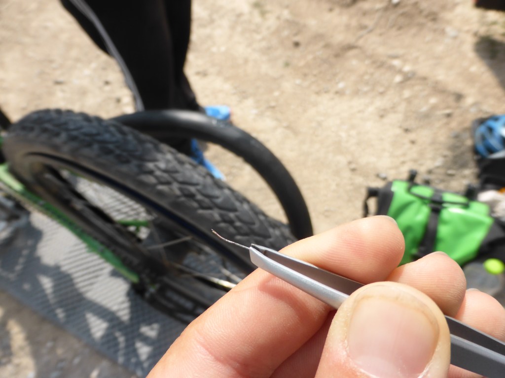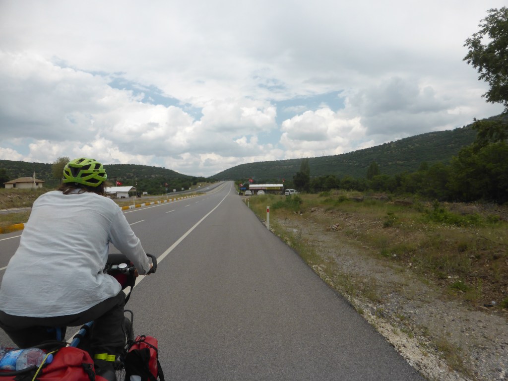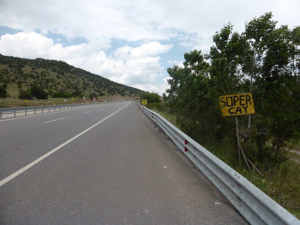 An einer Wasserstelle füllten wir mal wieder unsere Flaschen auf und als wir wieder losfahren wollten, bemerkte Karin, dass ihr Hinterreifen Luft verlor. Na gut, dann mal wieder den Übeltäter suchen. Dieses Mal fanden wir ihn schnell, es war ein kleines spitzes Metallstück, das einen 1mm breiten Schlitz in den Schlauch gemacht hatte. Also schnell wieder flicken und weiter ging es. Es ging wieder auf die große Straße, die hier Schnellstraße genannt wird und mit ihr die Hügel hinauf. Zum Glück war es wieder bewölkt, da ging es den Berg besser hinauf! Und am Straßenrand gab es immer wieder Stände, wo es Çay, Honig und Käse aus den Dörfern an der Straße gab. Für jeden Stand gab es Schilder, die auf den Stand aufmerksam machten, meist schon einige Kilometer vorher, da hatten wir Unterhaltung beim Wörter raten und Schilder lesen.