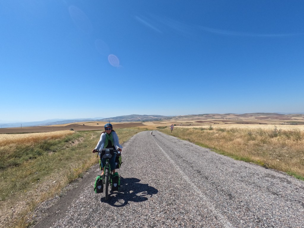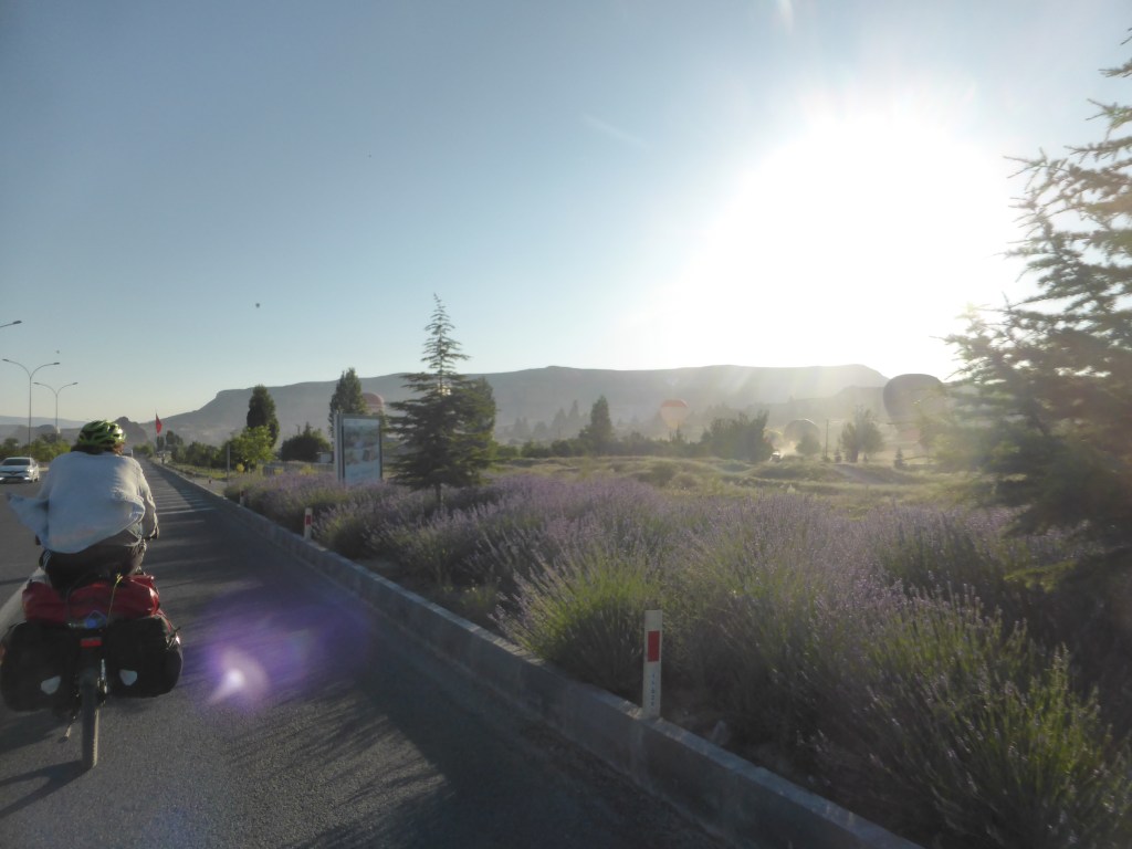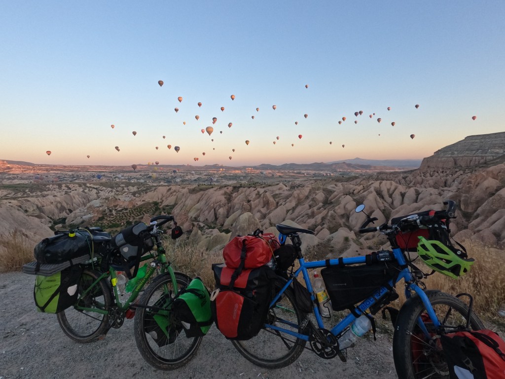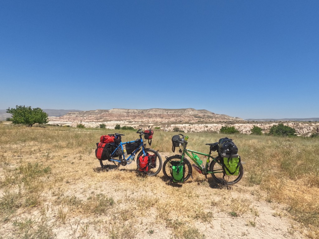 Am Mittwoch, dem 5.7.23 ging es dann aber wirklich nach dem Frühstück los. Wir wollten die Gegend noch ein bisschen mit dem Fahrrad erkunden und einen schönen Schlafplatz finden, um am nächsten Morgen die berühmten Heißluftballons über Kappadokien selbst zu sehen. Wir fuhren einige Sandpisten hin, her, runter und wieder rauf und fanden das viel anstrengender als einfach mit dem Rad viele Kilometer auf der Straße zu fahren.