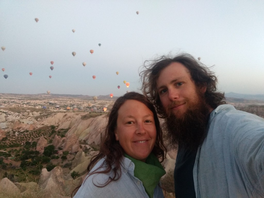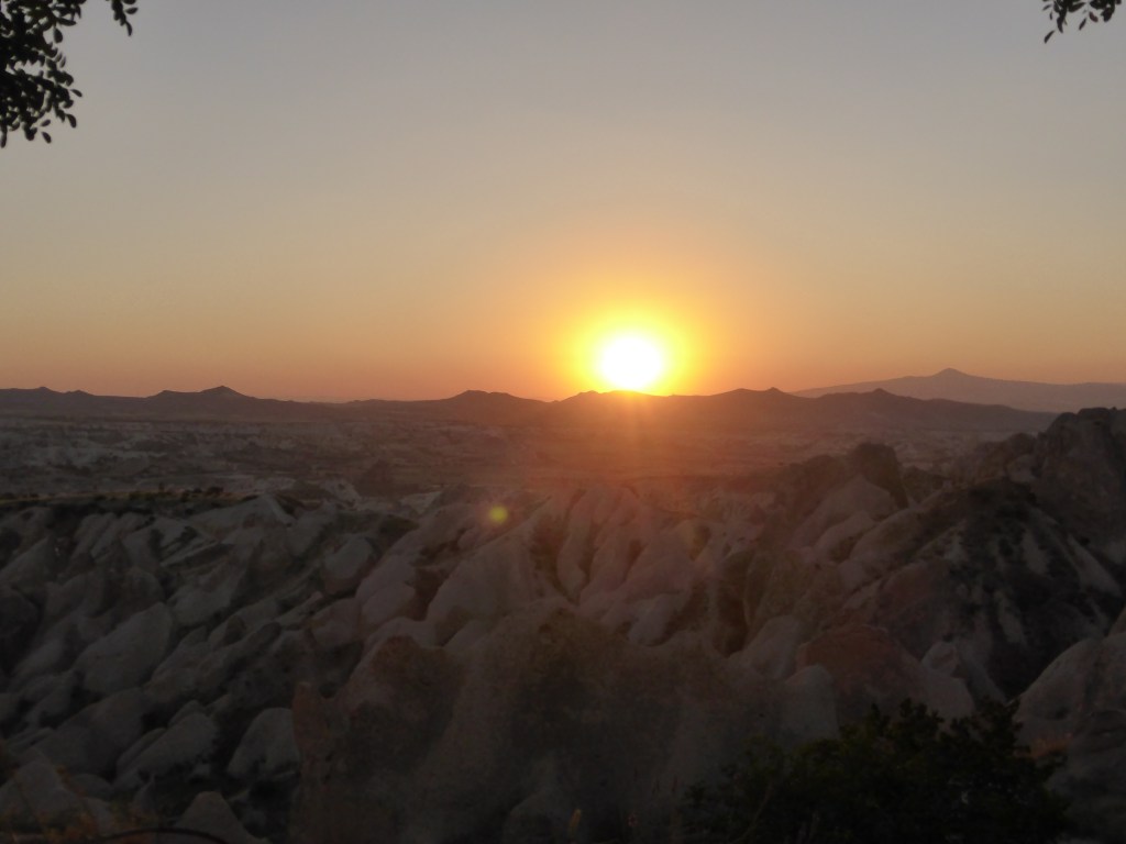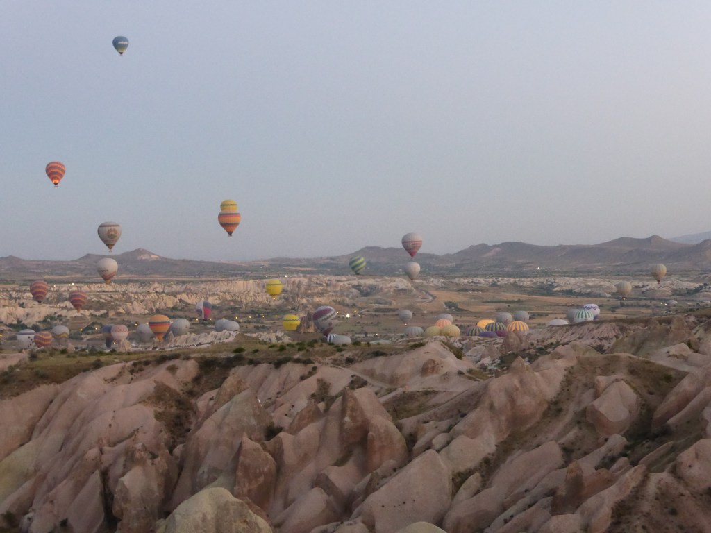 Um halb 4 standen wir also richtig motiviert 😉 auf, packten alles zusammen und schauten gespannt auf das noch dunkle Tal, aus dem sich die Heißluftballons bald erheben sollten. Wir hörten schon die Ventilatoren, die die Heißluftballons aufpustete. Und tatsächlich schien es im Halbdunkel so, als würden sich neue Berge zwischen den Bergen erheben.