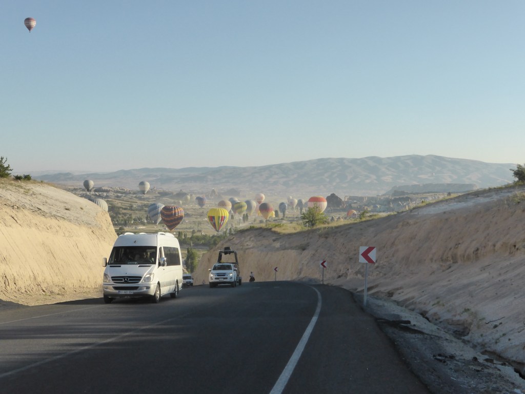 Dann bekamen wir Hunger und frühstückten mit Blick auf die Ballons und waren ungefähr um 6 Uhr bereit, loszufahren. Da war es noch herrlich kühl bei ca. 17 Grad. Wir fuhren vielen Kleinbussen und Jeeps entgegen, die die Menschen, die Körbe und die Heißluftballons selbst wieder zurück fuhren.