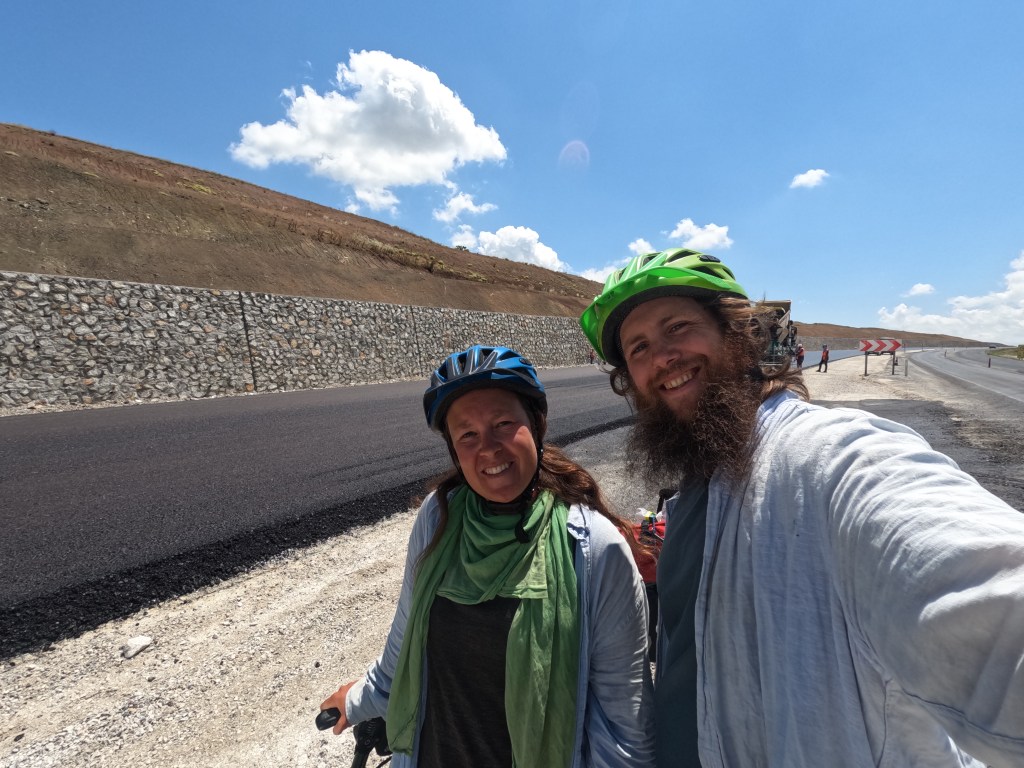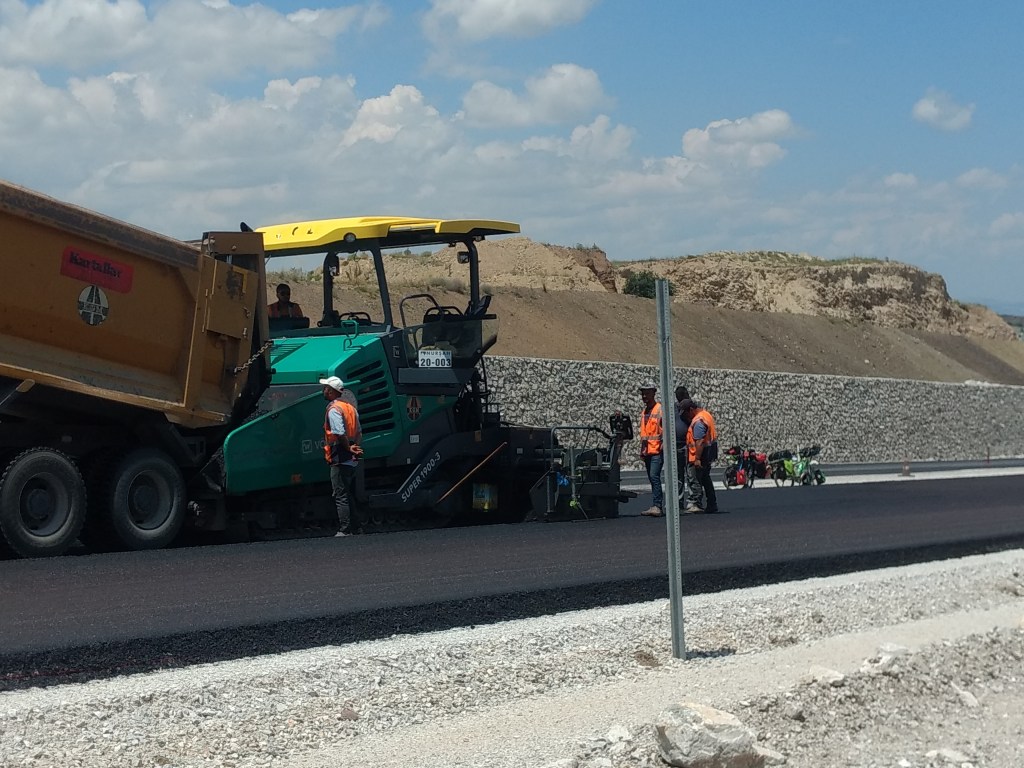 Dann wurde die Straße einspurig und auf die andere Straßenseite geleitet. Wir sahen auch warum. Bauarbeiter waren gerade dabei, diese Seite der Straße zu asphaltieren. Da nicht alle Männer gleichzeitig auf den Maschinen sitzen können, standen ein paar am Rand und tranken Tee. Sie luden uns auf einen Tee ein und da wir fasziniert von den Maschinen und der Arbeit waren, stellten wir unsere Fahrräder auf den Mittelstreifen und schauten uns die Arbeit bei einem Becher Çay an.