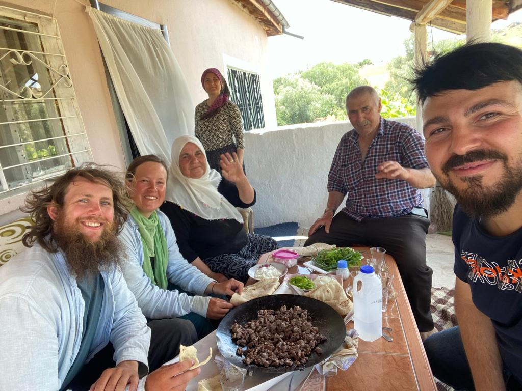 Ca. eine Stunde später waren wir einige Höhenmeter weiter oben und sahen ein Auto, das auf der Kuppe wartete. Als wir dort waren, stieg ein junger Mann, Ibrahim, aus und sagte uns in sehr gutem Englisch, dass er uns schon vor ein paar Minuten der Berg hochradeln gesehen hat, „Respekt!“. Er war inzwischen zu Hause gewesen, und dort hat seine Familie gesagt, er solle uns Radfahrende zum Essen einladen. Die Familie wohnte im nächsten Dorf an der Straße. Wir wollten uns diese Chance, bei einer Familie im Dorf mitzureißen, nicht entgehen lassen und fuhren seinem Auto hinterher zu seiner Familie.