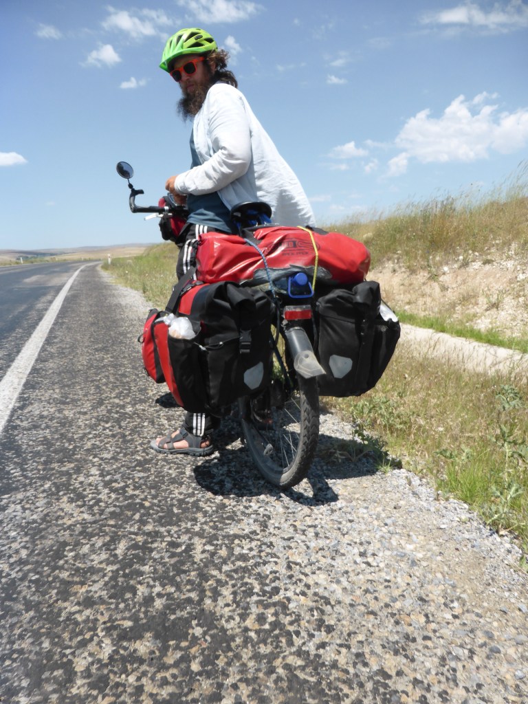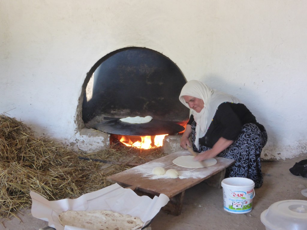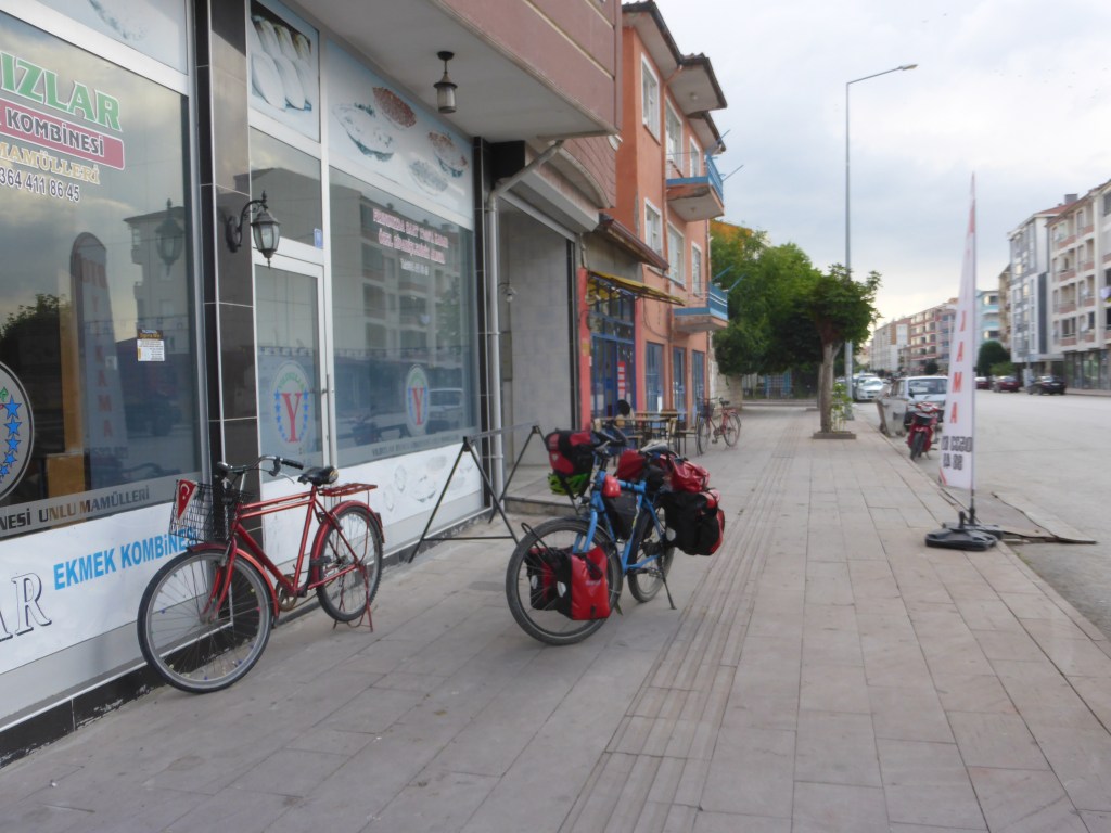 Als wir an einem Bäcker vorbeifuhren, rief der uns etwas zu. Wir hielten an, um vielleicht Simit zu kaufen. Der Bäcker lud uns auf einen Çay ein, machte Fotos mit uns und wir durften in der duftenden Backstube mitten in all den Broten Çay trinken. Wir fuhren weiter und keine 100 Meter später den Hügel hinauf wurden wir von einem Mann, der gerade ein Auto auf einem großen Platz wusch, zu einem Tee eingeladen. Es stellte sich heraus, dass dies der Treffpunkt für LKW-Fahrer war, die sich kurz danach mit uns versammelten und Tee tranken. Sie fahren gerade vor allem Getreide, das ja gerade in der Gegend gedroschen wird. Ansonsten fahren sie auch viele Zuckerrüben, aber eigentlich alles. Sie fragten uns, in welche Richtung wir fahren und zeigten, dass wir jetzt erstmal einen Berg aus der Stadt rausfahren müssen. Naja, dann mal weiter…