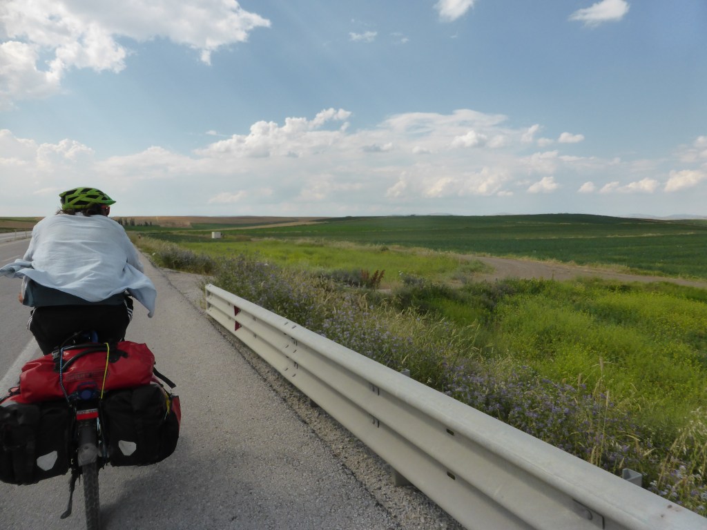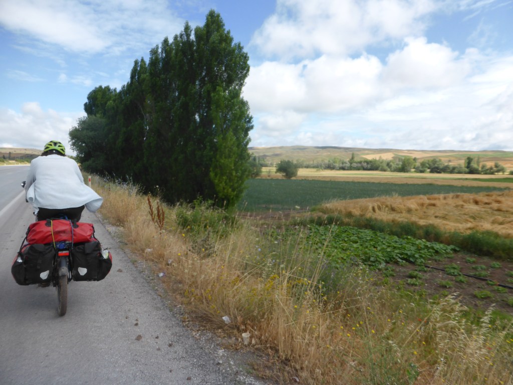 Mit vollen Bäuchen und voller guter Laune fuhren wir weiter durch die Getreidefelder über den heißen Asphalt. Es war wie über Knallerbsen fahren, denn der Asphalt schlägt bei dieser Hitze Blasen, die zerplatzen, wenn man drüberfährt…