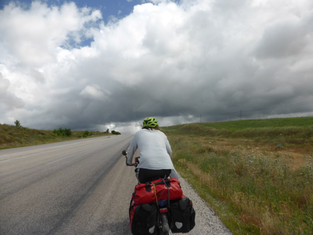 Als wir aus dem Dorf rausfuhren, wurde der Himmel immer dunkler und es begann zu gewittern. Mist, wir wollten ja unser Zelt vor dem Regen aufgebaut haben. Wir fuhren etwas in Eile an der Straße entlang, um einen geeigneten Schlafplatz zu finden. Nach kurzer Zeit wurden wir zwischen einer Reihe Pappeln und einem Zwiebelfeld ohne Regner fündig. Gerade, als wir das Zelt anfingen, aufzubauen, fing es an zu regnen. Gut, dass wir das schon oft genug gemacht haben und Zelt aufbauen und einräumen nur kurz dauert. Wir waren zwar leicht nass, aber es war alles verstaut. Und natürlich hörte es wenige Minuten danach auch wieder auf zu regnen. Wir waren gerade fertig mit dem Kochen unserer Nudeln mit Soße, als ein Traktor am Zelt vorbeigefahren kam und neben dem Zelt anhielt. Der Mann, der ausstieg, sagte, es sei kein Problem, dass unser Zelt dort steht. Er wollte in der Nacht die Zwiebeln bewässern. Dafür musste er aber nochmal kurz warten, weil es regnete…