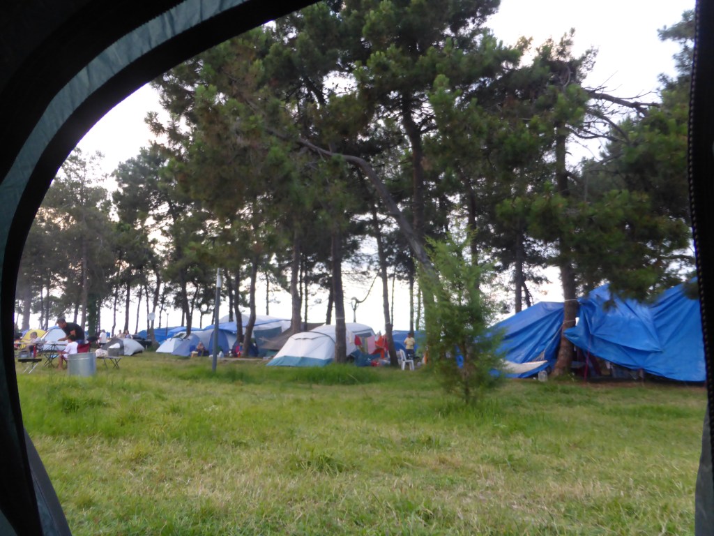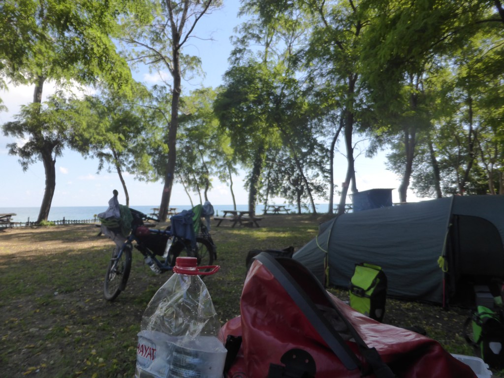 Dann ging es wieder auf die zum Glück sehr flache Hauptstraße. In einer Stadt wollten wir Pause machen, da wurden wir von der Straße von drei Männern zu Tee, Köftebrot und Ayran eingeladen. Einer der Männer ist vor kurzem mit dem Motorrad bis nach Deutschland und wieder zurück über den Balkan gefahren und hat uns Fotos gezeigt. Wir waren uns einig, dass man beim Reisen seinen Horizont erweitert. So hatten wir also schon Pause gemacht, waren gestärkt und konnten weiter radeln bis zum erwähnten Campingplatz hinter der Stadt Terme. Wieder mal konnten wir die türkische Campingkultur erfahren. Wir sahen viele Camping-Çaykocher natürlich, viele Camper, noch mehr Autos, Hängematten, Planen unter und auch über den Zelten. Wir haben sogar Schränke und eine mobile Waschmaschine gesehen! Und dazwischen wir mit unserem kleinen Zelt und den zwei Fahrrädern daneben und vollkommen glücklich, weil wir auch alles dabei haben!