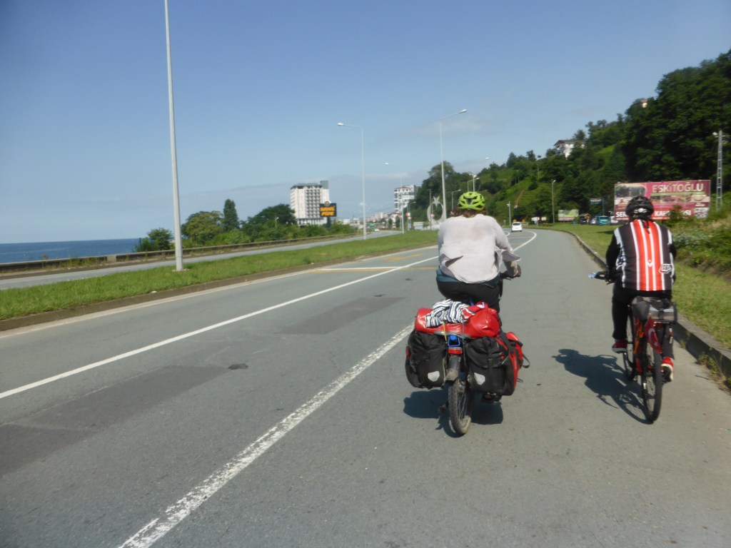 Die Fahrräder haben wir dann trotzdem beladen und sind ein paar Hundert Meter zum Einkaufen, um dann am Ortsende in einem kleinen Park zu frühstücken. Danach ging es uns wieder gut und wir konnten den vorletzten Radeltag in der Türkei antreten. Mustafa, unser radelnde Host des çayhauses hatte morgens noch bei Murat, einem weiteren Warmshowers Host auf unserer Route angerufen und gefragt, ob wir dort heute übernachten können. Murat ist sehr herzlich und lud uns gleich ein. Also wussten wir, dass wir heute ca. 80 km zu fahren hatten. Die ersten 45 Kilometer vergingen wie im Flug, da unsere schöne Straße fast durchgängig einen breiten Seitenstreifen hatte und wir so mal wieder nebeneinander fahren konnten und uns über Allah und die Welt unterhalten konnten. Der Tee wird hier gerade geerntet, mit Seilbahnen den Hang heruntergeschickt und auf Transporter geladen
