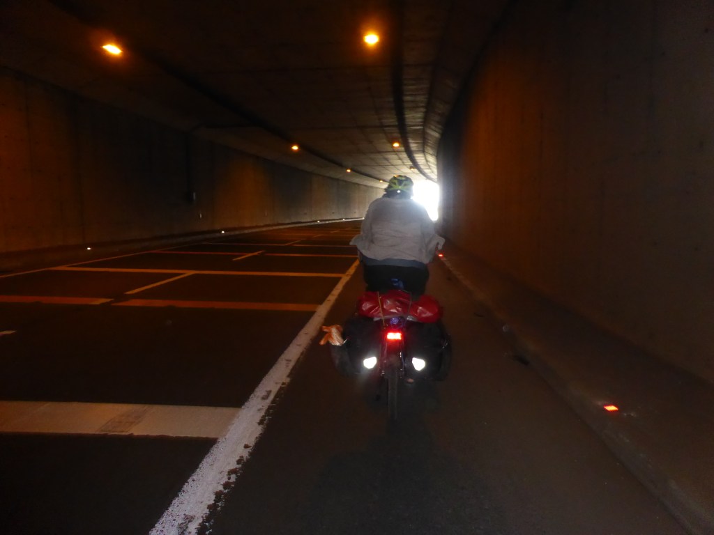 Und zwischen zwei dieser Tunnel radelte uns Frank, ein chinesischer Reiseradler entgegen. Wir klingelten und waren glücklich, ein vollgepacktes Fahrrad zu sehen. Er war auch froh und kam zu uns rüber, so konnten wir uns kurz über unsere Routen, die Straßen und mögliche Unterkünfte austauschen. Neu beschwingt ging es weiter durch den nächsten Tunnel.