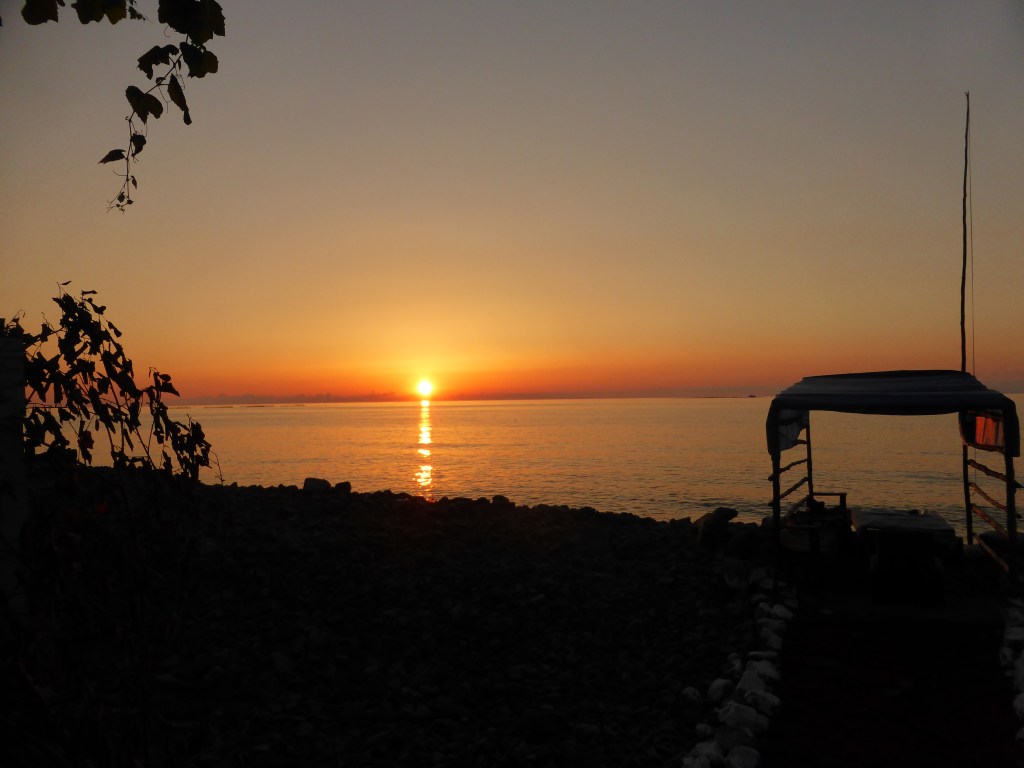 Nach der Mittagspause sahen wir ein Auto mit einem Ulmer Kennzeichen und beschlossen, es zu verfolgen ;-). Es machte an einem Laden ganz in der Nähe Halt, da konnten wir mit den Schwaben schwätzen. Die Familie lud uns auf einen Kaffee in ihren Garten ein, der nur einen Kilometer entfernt war. Dort sprachen wir über die Familie, das Reisen und das Genießen des Lebens. Dann ging es weiter, denn wir wollten ja bei Murat ankommen und wussten noch nicht genau, wo er wohnt. Karin wollte nochmal kurz anhalten, um etwas zu essen, weil der Kaffee sie etwas zittrig machte. Da schaute Simon nochmal auf die Karte, um Murats Zuhause zu finden und sagte: „Also laut Karte müsste es genau hier sein“. Und da sahen wir zwischen Straße und Meer tatsächlich eine Hütte mit schönem Garten und auch schon eine winkende Hand von unserem Gastgeber. Wir brachten unsere Fahrräder zu ihm und hatten einen schönen Abend mit ihm, einer iranischen Tramperin und einem türkischen Freund von ihm. Die Iranerin kochte traditionelles iranisches Essen mit Huhn, Tomaten, Zwiebeln, Reis und Gewürzen und zum Nachtisch gab es Wassermelone. Wir bauten unser Moskitonetz auf dem Balkon auf und schliefen mal wieder zwischen Meer und Bergen ein.