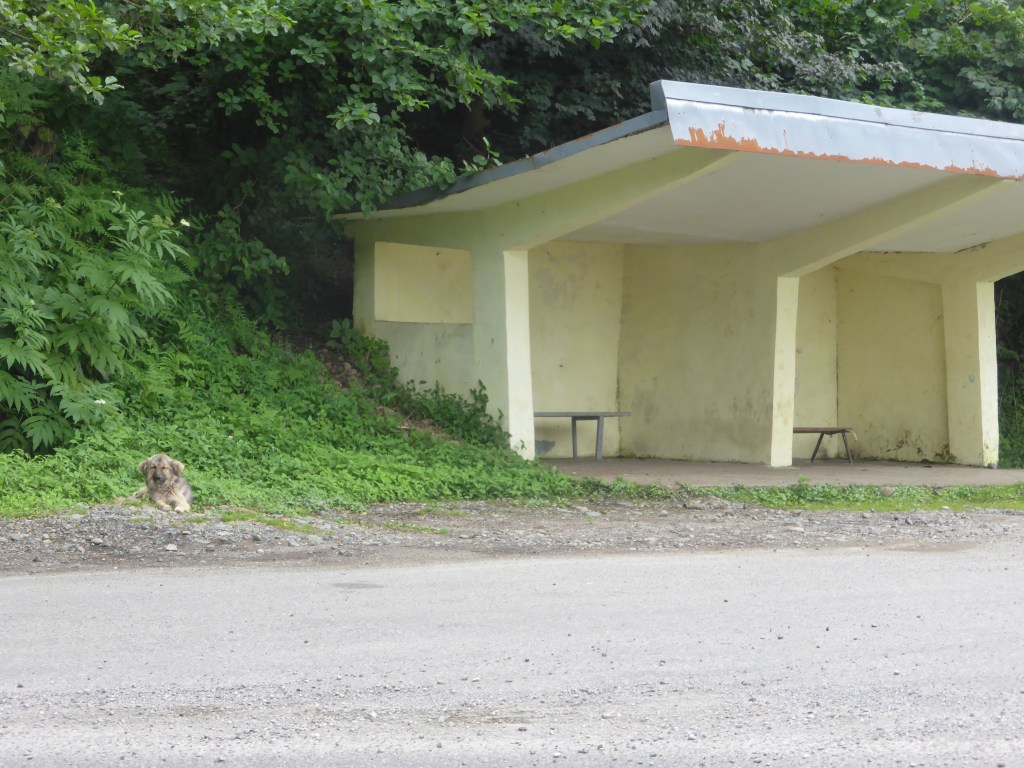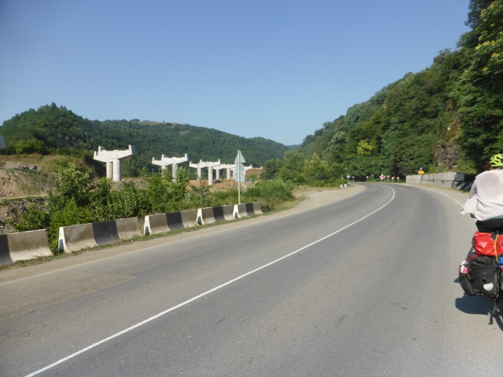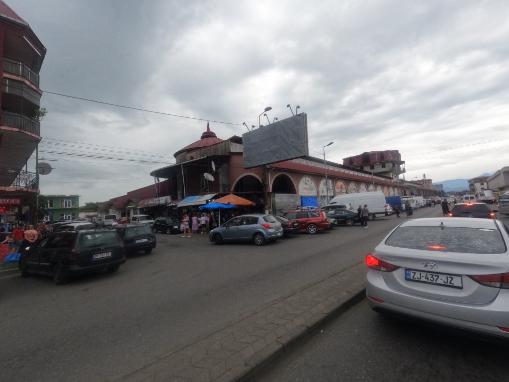 Dann kamen wir nach Zestaponi, wo wir wieder auf die große Straße fuhren. Ab da hatten wir viele Gelegenheiten, uns die georgischen Nummernschilder anzuschauen. Die haben nämlich nicht georgische, sondern lateinische Schriftzeichen, die folgendermaßen angeordnet sind: zwei Buchstaben – drei Zahlen – zwei Buchstaben. Und man darf sich alle Zeichen komplett frei aussuchen. Viele Autobesitzer*innen versuchen anscheinend, viele gleiche oder ähnliche Buchstaben auf ihren Schildern zu haben, aber ich glaube, 4 gleiche Buchstaben sind nicht erlaubt, daher XX – XK oder Ähnliches. Wir sahen auch ein Auto mit MA-RI fahren.
