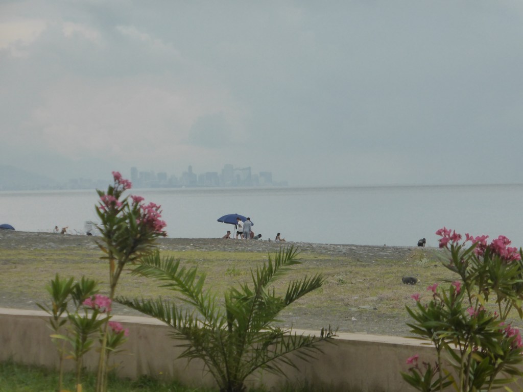 Am 24.07. frühstücken wir also noch gemütlich in unserem Hotelzimmer, danach packten wir alles zusammen und machten uns auf den Weg raus aus Batumi, etwas am Meer entlang und dann rein ins Landesinnere von Georgien. Der Weg aus der Stadt heraus war einfach, es gab nur eine Straße und die haben wir für die nächsten 30 Kilometer genommen. Dann kam die Stadt Kobuleti, dort haben wir uns an die Promenade gesetzt und noch ein letztes Mal am Schwarzen Meer Pause gemacht.