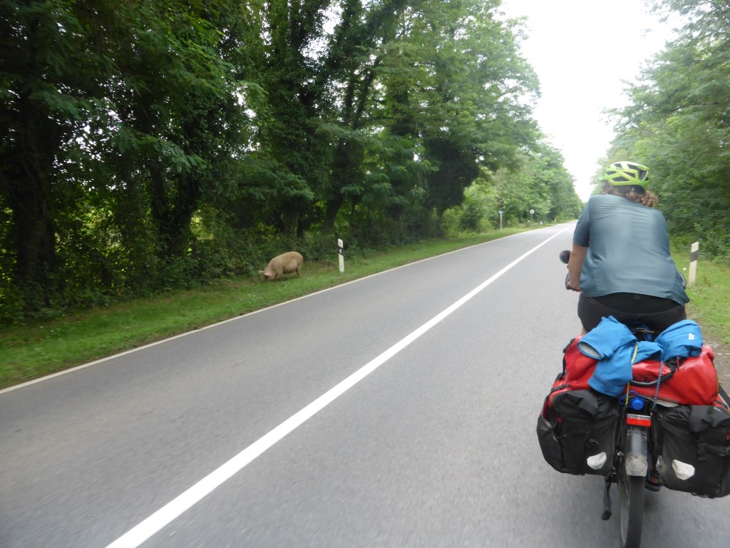 Kurz bevor wir einen Schlafplatz hinter einer hohen Brombeerhecke fanden, trafen wir zusätzlich noch ein Schwein (nicht Wildschwein), das am Straßenrand auf Futtersuche war.