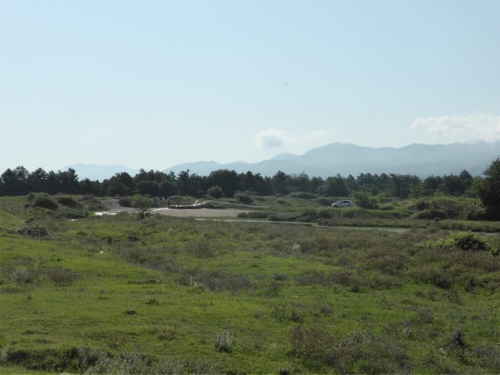 Am 25.07. wurden wir endlich mal wieder von der Sonne geweckt, wir bauten unser Zelt ab und starteten, um beim nächsten Laden ein Brot für das Frühstück zu kaufen. Mitten im Nichts fanden wir einen kleinen Laden, im Nachbarraum wohnte vermutlich die Besitzerin. Als wir unser Brot dann hatten, konnten wir direkt gegenüber an einer Bushaltestelle Schatten finden und frühstücken. Weiter ging es landeinwärts, meist an einem kleinen Fluss entlang. Irgendwann kamen wir leider wieder auf die Hauptstraße, dort war richtig viel Verkehr. Die gute Seite der Hauptstraße ist, dass es so etwas wie Raststätten gibt. Eigentlich waren es ein kleiner Kiosk und ein „Fast Food“ Laden. Fastfood ist hier jedoch eine ganz eigene Sache und die Teiglinge, in denen meist Käse oder Bohnen eingebacken sind, gehören fest zu der georgischen Kultur. Wir holten uns auch einen mit Käse und einen mit Bohnen und machten Mittagspause. Kurz nach der Raststätte ging es weg von der großen Straße und weiter durch kleine Dörfer, wir konnten sogar häufig nebeneinander fahren, richtig gut! Kurz vor den nächsten Hügeln gab es eine heiße Quelle mit schwefeligem Wasser, die haben wir uns natürlich nicht entgehen lassen. Dort trafen wir noch zwei junge Pärchen aus Polen, die sich, so wie wir auch überlegt hatten, dort zu zelten. Wir fanden einen guten Platz, um drei Zelte aufzubauen und noch ein kleines Lagerfeuer zu machen. Dort ließen wir den Abend gemütlich mit unseren neuen Bekannten ausklingen.