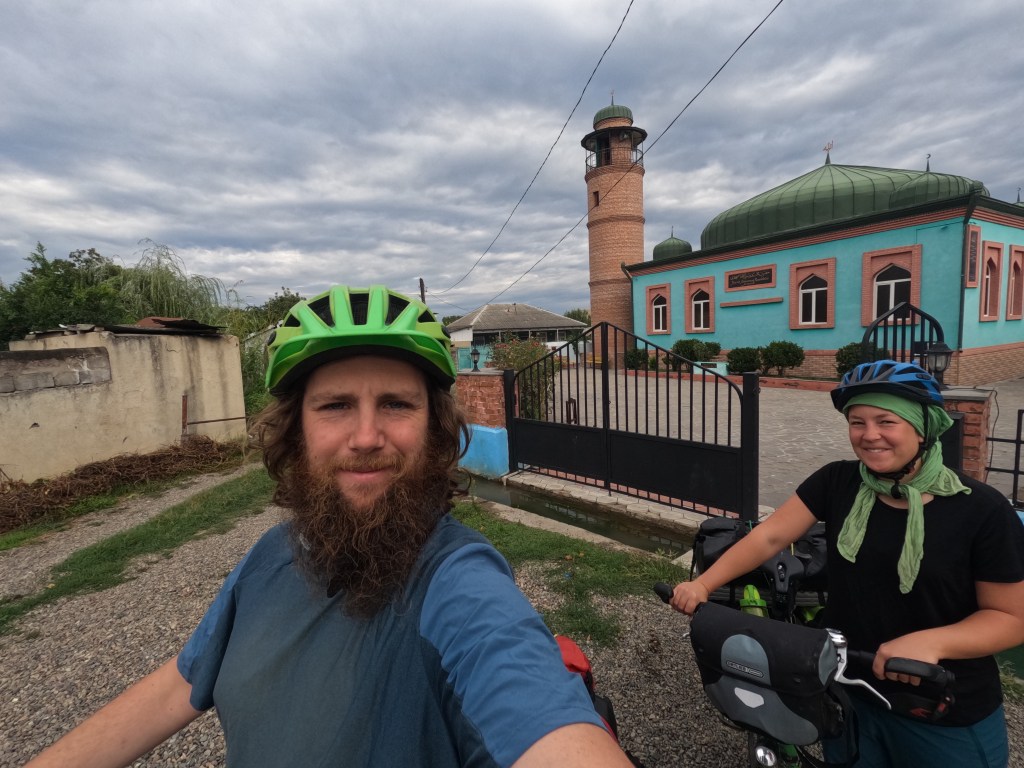 Etwas später kamen wir an einer Moschee vorbei und dachten: eine Moschee ist doch ein sicherer Ort, um zu übernachten, wenn man keine Herberge findet. Wir fragten einen Mann, der gerade vorbei lief, ob wir auf dem Gelände der Moschee zelten dürften. Er rief den Imam an und dieser stimmte zu. Wir kochten und aßen schonmal unser Abendessen. Um kurz vor 20 Uhr kam ein Mann, der uns erklärte, dass wir in der Moschee schlafen dürften, Simon auf der Seite, wo die Männer beten und Karin auf der Seite der Frauen (die beiden Teile waren nur durch einen Vorhang abgetrennt, die große runde Kuppel konnte von beiden Seiten gesehen werden).
