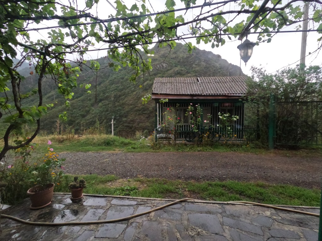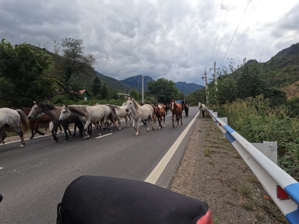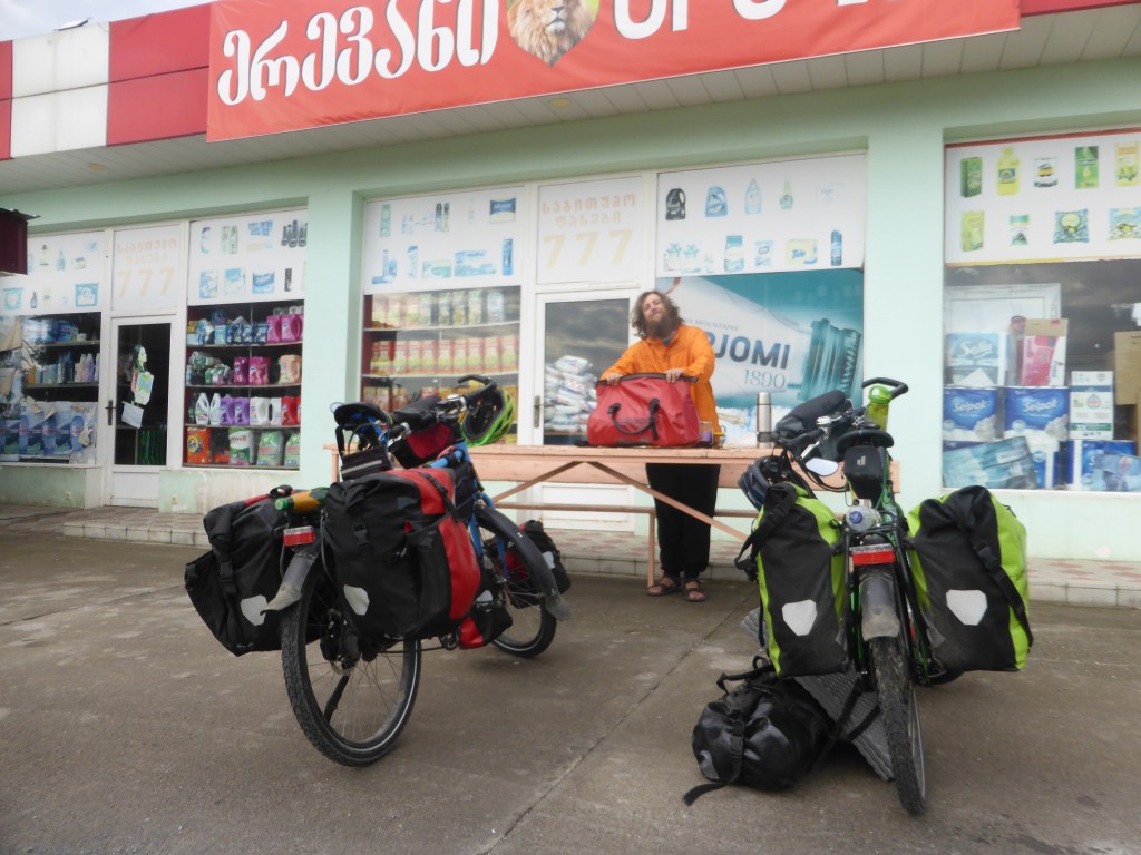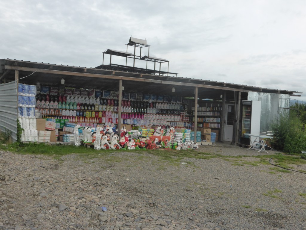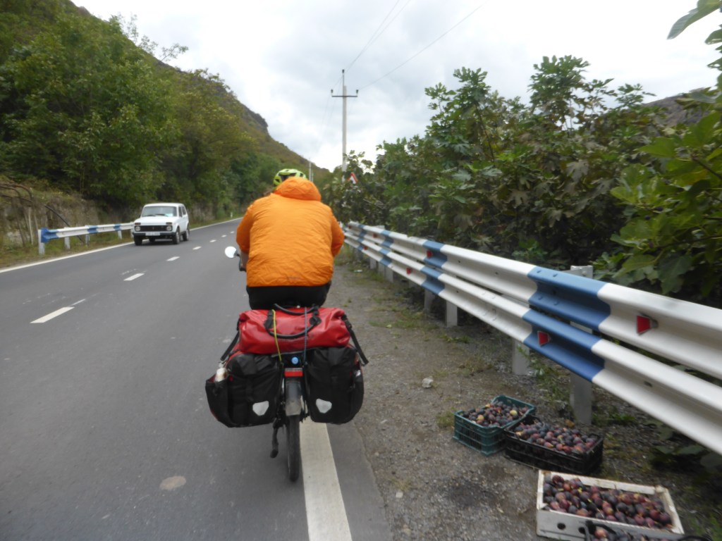 Wir rollten fröhlich weiter auf den letzten Kilometern in Georgien, vorbei an Hügeln, Dörfern, Waschmittelständen…