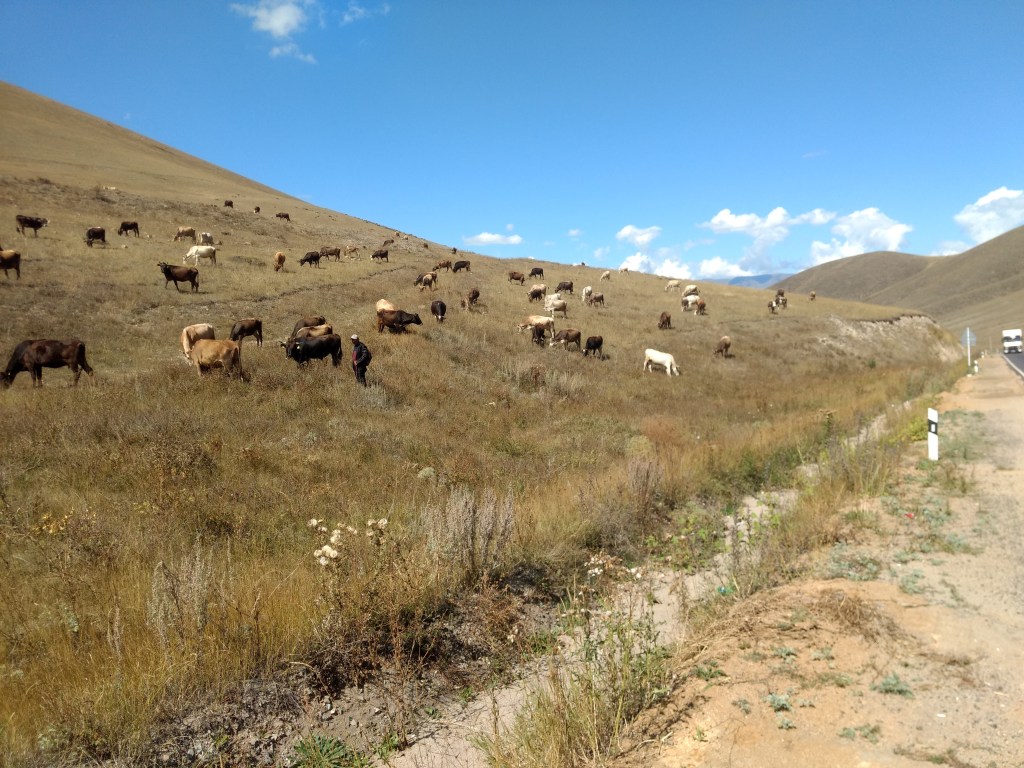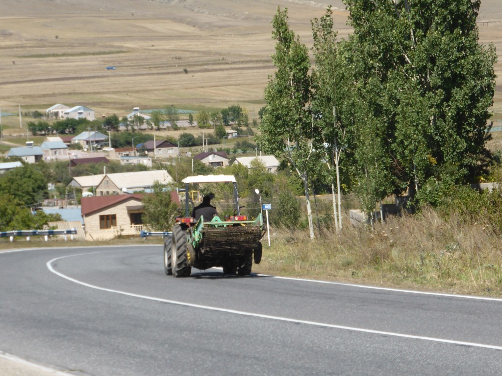 Am Freitagmorgen wurden wir von der über den Hügeln aufgehenden Sonne geweckt. Wir frühstückten noch im Haus und sahen dabei, wie die Kuhherden wieder auf die Weiden getrieben wurden. Dann verabschiedeten wir uns vom Scheich und fuhren los, um heute Jerewan zu erreichen. Wir fuhren noch durch ein paar Bergdörfer, wo wir die Traktoren bestaunten.