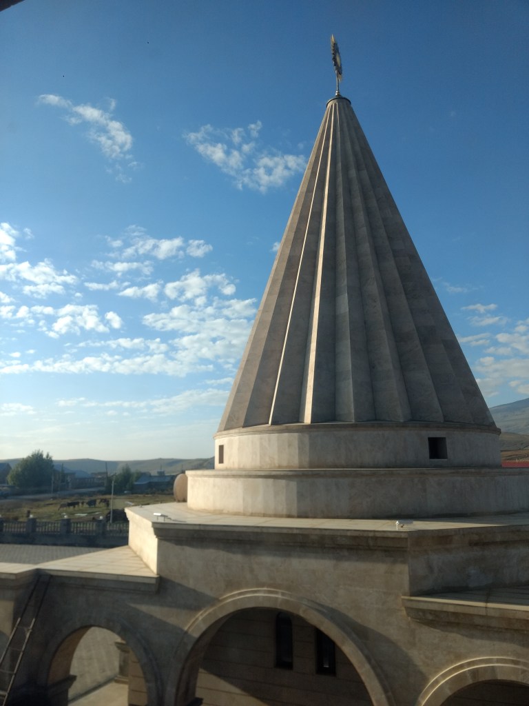 So radelten wir bis in das Dorf Rya Taza, wo ein jesidischer Tempel stand, den wir uns kurz anschauen wollten. Wir betraten ihn ohne Schuhe und wurden danach vom dortigen Scheich auf einen Tee eingeladen. Da wir keine gemeinsame Sprache zum Reden hatte, rief er einen anderen Scheich an, der in Deutschland lebt. Dieser kam und erzählte uns über die jesidische Religion und Kultur.
