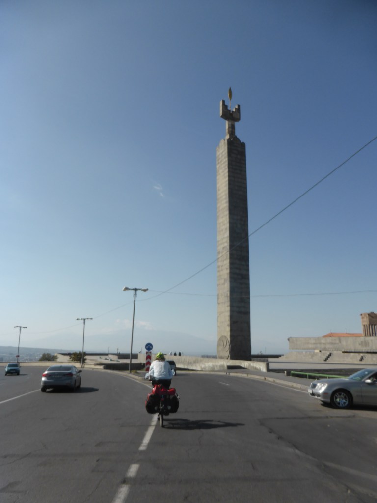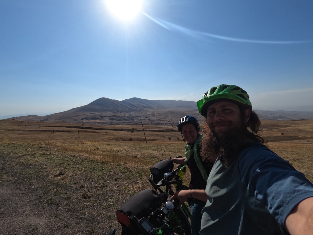 In der Stadt ging es zum Glück vor allem bergab, aber kaum aus der Stadt raus, konnten wir schon die (Müll-)berge sehen, durch die wir hochfahren sollten. Mitten im Anstieg hatte ein Fahrer eines Transporters Mitleid mit uns und lud uns ein, uns und unsere Fahrräder über den nächsten Hügel mitzunehmen. Wir waren ganz froh, vor allem als wir an den gigantischen Müllbergen mit entsprechendem Geruch vorbeirasten. Er nahm uns mit bis zu sich nach Hause im nächsten Dorf und zeigte uns erstmal seine Tiere im Hinterhof: Katzen, Kaninchen, Hühner, Enten, Schweine (noch kleine) und die Schafe hörten wir nur. Er lud uns auf Tee, Kuchen und frische Pistazien ein, diese pflückte er einfach vom Baum im Garten! Leider ist unser Russisch nicht gut genug, also wurde die Schwester, die in München lebt, angerufen. Kurz danach gab es auch schon Mittagsvesper, was wir natürlich nicht verpassen durften. Es gab Brot, eingelegtes Gemüse, Bohnen mit Ei, zweierlei Käse und wahrscheinlich selbst gemachte Wurst. Danach noch einen Fruchtsaft und wir bekamen noch Walnüsse und Pistazien mit. Er fuhr noch vor uns her bis zur Schnellstraßenauffahrt und dann fuhren wir weiter… Die Schnellstraße verlief ziemlich flach den Rest des Tages.