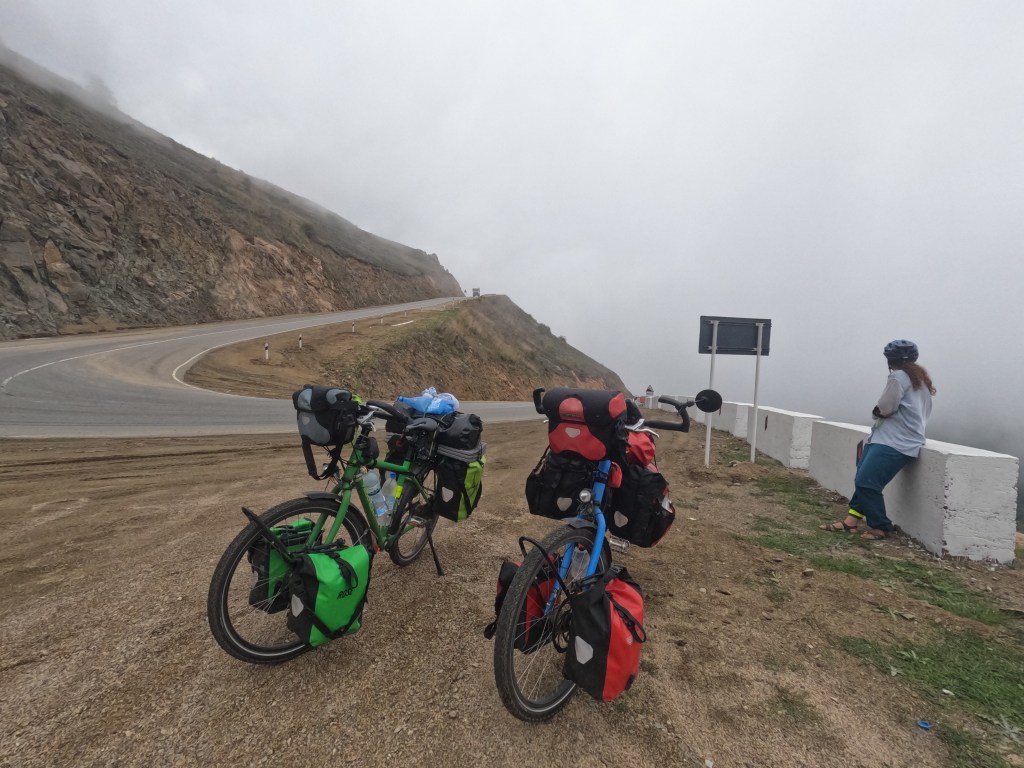 Wir machten ein paar Bilder, bevor es uns zu kalt wurde und dann warteten 35 Kilometer Abfahrt auf uns. Zwischendrin regnete es immer wieder, wir fragten uns, on wir auch Schneeflocken gesehen hatten. Naja, in Sandalen ging es gut 🙂 Allmählich wurde es immer wärmer und wir konnten irgenwann auch wieder die Landschaft sehen!
