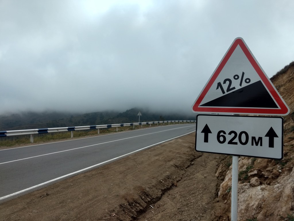 In einer Kurve, in der wir kurz Pause machten, konnten wir am Anfang noch gut die Straße über uns erkennen, kurz danach war sie in der Wolke verschwunden. Es wurde auch kälter, also zogen wir bald Jacken an und fuhren weiter… Dann hatten wir die Wolken erreicht und sahen kaum noch 50 Meter weit. Immer wieder blickten wir auf Navi und Fahrradcomputer, die uns anzeigen sollten, wann wir auf einer Höhe von 2535 Metern sein sollten. Und dann war es wirklich plötzlich vor uns: Das Schild des Meghri-Passes. Jetzt, wo wir oben waren, war es doch gar nicht so schlimm gewesen… Naja