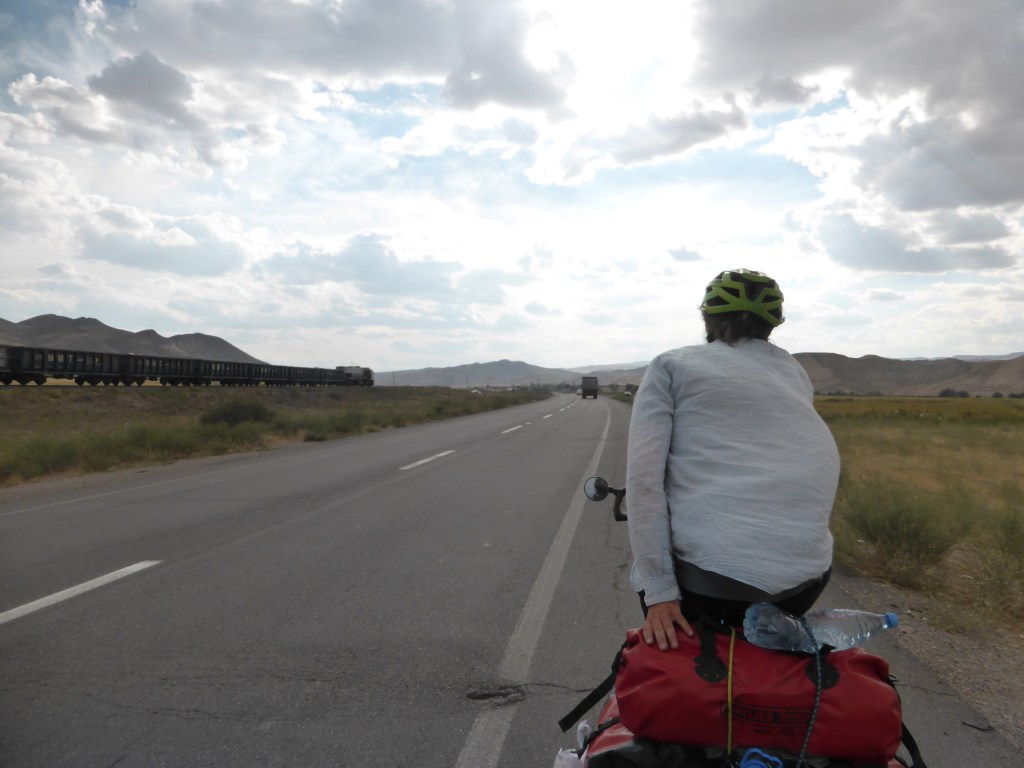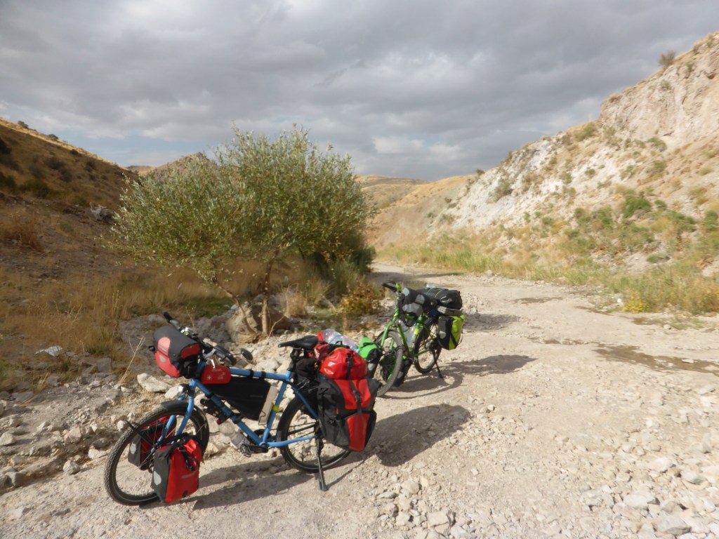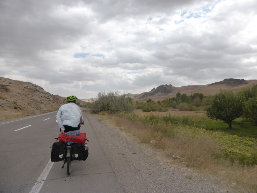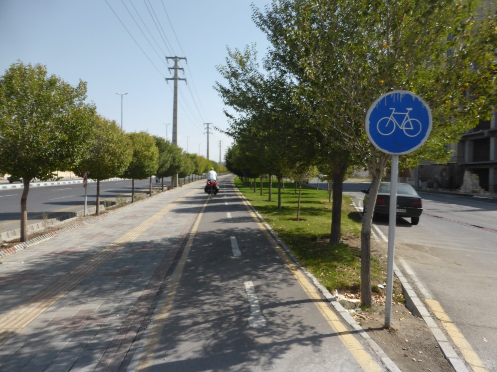 Am 1.10. ging es nach einem umfangreichen Frühstück ging es wieder los, endlich wieder aufs Fahrrad. Erstmal mussten wir einen großen Teil von Tabriz durchqueren, die Stadt hat immerhin 1,7 Millionen Einwohnende. Dabei ging es stetig bergauf und was das Ganze noch anstrengender machte, waren die Abgase, die in der Luft lagen. Trotzdem arbeiteten wir uns langsam vorwärts, bis wir nach ca. 20 Kilometern in einer noch nicht richtig fertigen Hochhaus-/Vorstadt-/Neubausiedlung einen Fahrradweg fanden. Den nahmen wir für den nächsten Kilometer und dann gab es neben unserem Weg tatsächlich richtig ordentliches Grün inkl. Bäume.