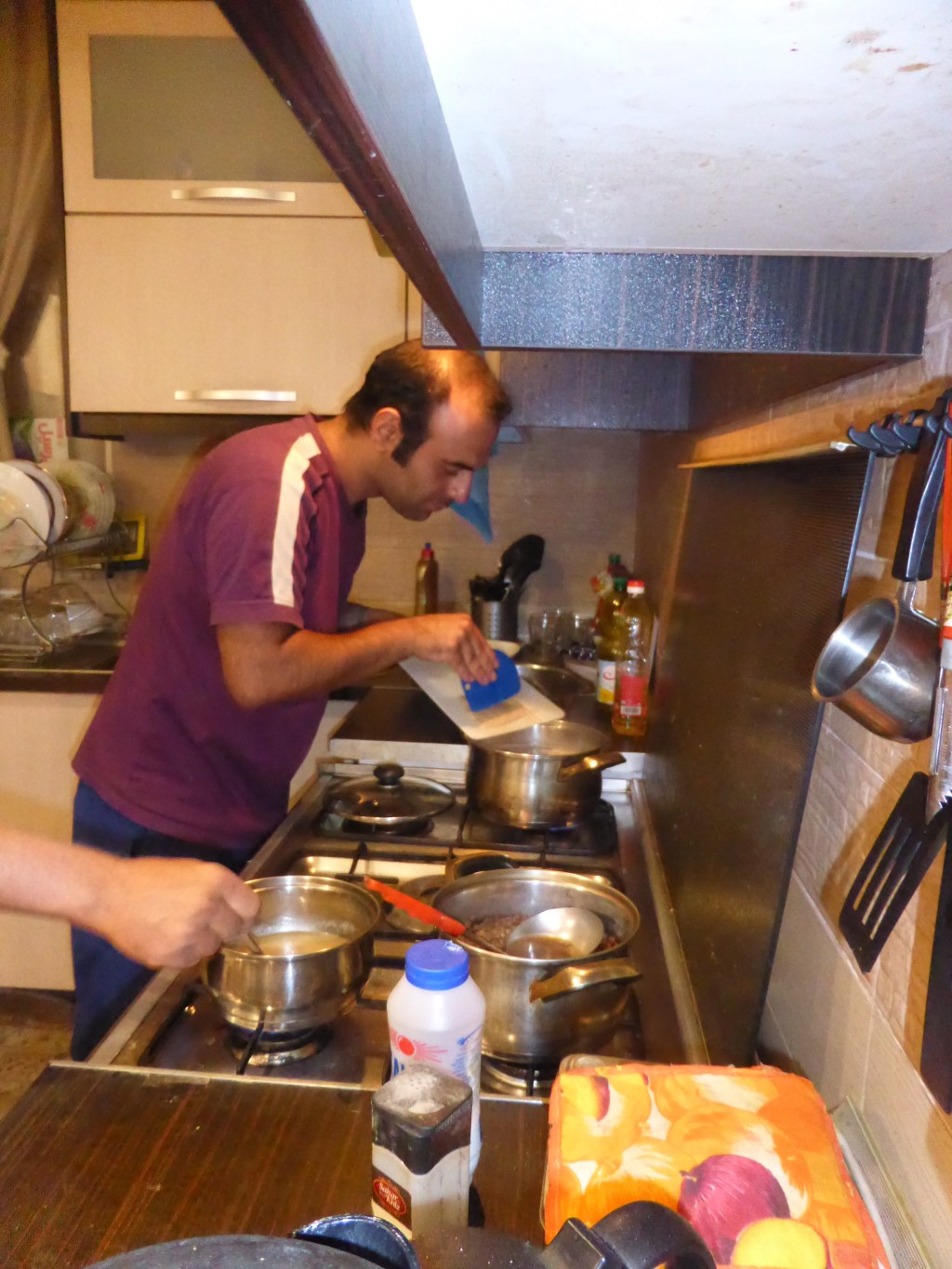 Wir fragten eine Familie, die gerade mit dem Auto vorbeifuhr. Sie meinten, dass es hier nicht sicher sei wegen Tieren und Dieben und wir sollten doch zu ihnen mit nach Hause nach Qom kommen. Sie zeigten uns ihren Garten, wo gerade die Granatäpfel reif sind, und schenkten uns welche, die sie frisch pflückten. Wir hätten auch gerne in dem Garten gezeltet, aber sie wollten uns gerne zu sich nach Hause einladen. Das Auto war voll, also radelten wir wieder ca. 10 Kilometer hinter dem Auto in die Stadt rein zum Haus der Familie. Das war ganz schön anstrengend und spannend, nachts durch eine iranische Stadt zu radeln. Bei der Familie angekommen, gab es erstmal Tee und Nüsse. Später kamen noch die Brüder des Vaters mit ihren Kindern. Die Tochter mit ca. 14 Jahren konnte am besten Englisch und unterhielt sich mit uns. Eine Schwägerin hat ihre Kindheit in Japan verbracht und zeigte uns Bilder davon. Der Vater fragte uns, ob wir in ein Restaurant gehen wollen oder lieber zuhause essen. Zuhause fanden wir passender, also holte er Kebab mit Reis für die ganze Familie, was wir an einer dünnen Plastiktischdecke auf dem Boden aßen. Nach einer Dusche konnten wir wieder mal glücklich und dankbar über die iranische Gastfreundschaft einschlafen.