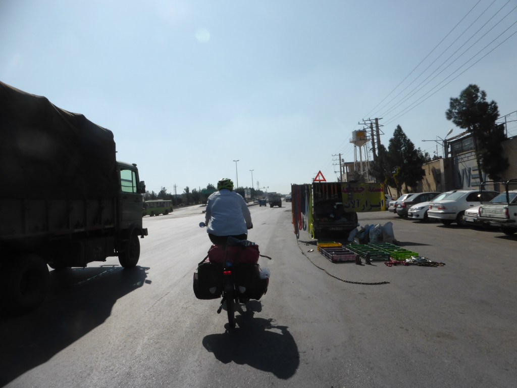Wir ließen ihn ein neues Versteck in einer Pflanze nebenan suchen, packten alles zusammen und fuhren weiter. Es gab neben der Straße, die wir gestern fuhren, noch eine komplett leere, gute Straße. Heute fuhren wir auf dieser Straße, denn wir sahen keinen Grund, es nicht zu tun. So war es sehr angenehm und so ruhig, dass wir iranisches Radio hören konnten. Heute ging es etwas hügeliger weiter, aber der Rückenwind half uns etwas.