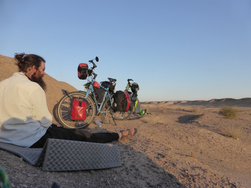 Abends waren wir kurz vor der Stadt Qom, als wir entscheiden mussten, ob wir noch vor der Stadt einen Platz für unser Zelt suchen oder noch durch die Stadt durch fahren und dann schauen, wo wir schlafen. Irgendwann hatten wir quasi durchs Nichtentscheiden entschieden, dass wir noch durch die Stadt fahren. So konnten wir auch noch Vorräte einkaufen und Wasser auffüllen. Als wir dann endlich raus aus der Stadt waren, fanden wir ein Feld, auf dem wir unser Zelt aufbauen wollten.