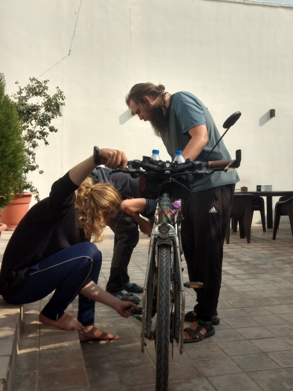 Die anderen waren alle auch am Tag vorher angekommen und wollten einige Tage in Isfahan bleiben. Direkt nach dem Frühstück fingen einige von uns an, Schläuche zu flicken, Ketten zu wechseln, nen neuen Tacho zu installieren und alles andere mögliche an den Fahrrädern zu basteln.