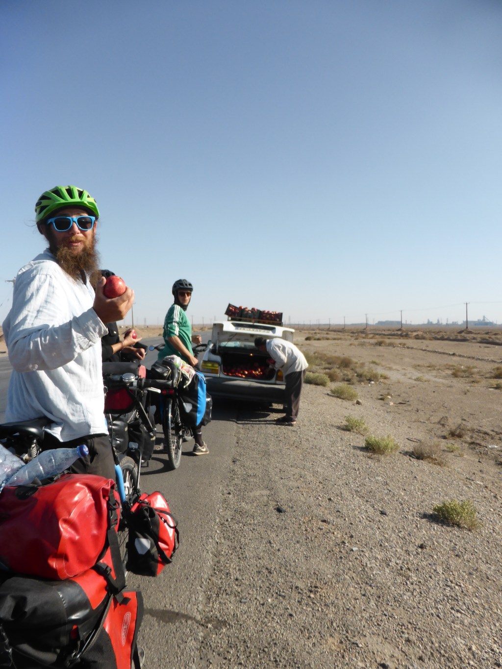 Am Freitag gab es wieder leckeres Porridge von Maik zum Frühstück und nach dem Einpacken ging es weiter. Beim Frühstück dachten wir noch, wir hätten Rückenwind, was auch für die ersten 5 Kilometer so war und wir richtig genießen konnten. Danach jedoch drehte der Wind und wehte erst von der Seite und dann von vorne. Wir wechselten immer wieder, wer vorne fuhr und fuhren trotzdem mit flottem Tempo der ersten Rast entgegen. 33 Kilometer nach unserem Schlafplatz war nämlich eine Tankstelle mit Laden, wo die anderen beiden tankten (für ihrem Kocher) und wir gemeinsam Vorräte kauften. Dann sahen wir, dass in weiteren 17 Kilometern ein Dorf ist, wo wir beschlossen, Mittagspause zu machen. In dem Dorf war ein kleiner Park und wir picknickten darin gemütlich. Ein Mann lief an uns vorbei, wir konnten uns nicht wirklich mit ihm verständigen. Nach weiner Weile kam er zurück mit einer Tasche voll mit Granatäpfel ( ca. 12 Stück). Wir bedankten uns und machten noch ein Selfie mit ihm. Nach weiteren wenigen Minuten kam er nochmal und brachte uns ein Glas Traubensirup, den man hier zu Brot und mildem Käse isst, mmmh. Vollbepackt fuhren wir weiter zum Laden, um Abendessen einzukaufen. Gerade, als wir alles verstaut hatten, fuhr Hossein, ein iranischer Reiseradler zu uns her. Er wohnt in Istanbul und ist dort auf seine Reise aufgebrochen. Er fuhr ein bisschen mit uns mit, mal neben, mal hinter und mal vor uns.