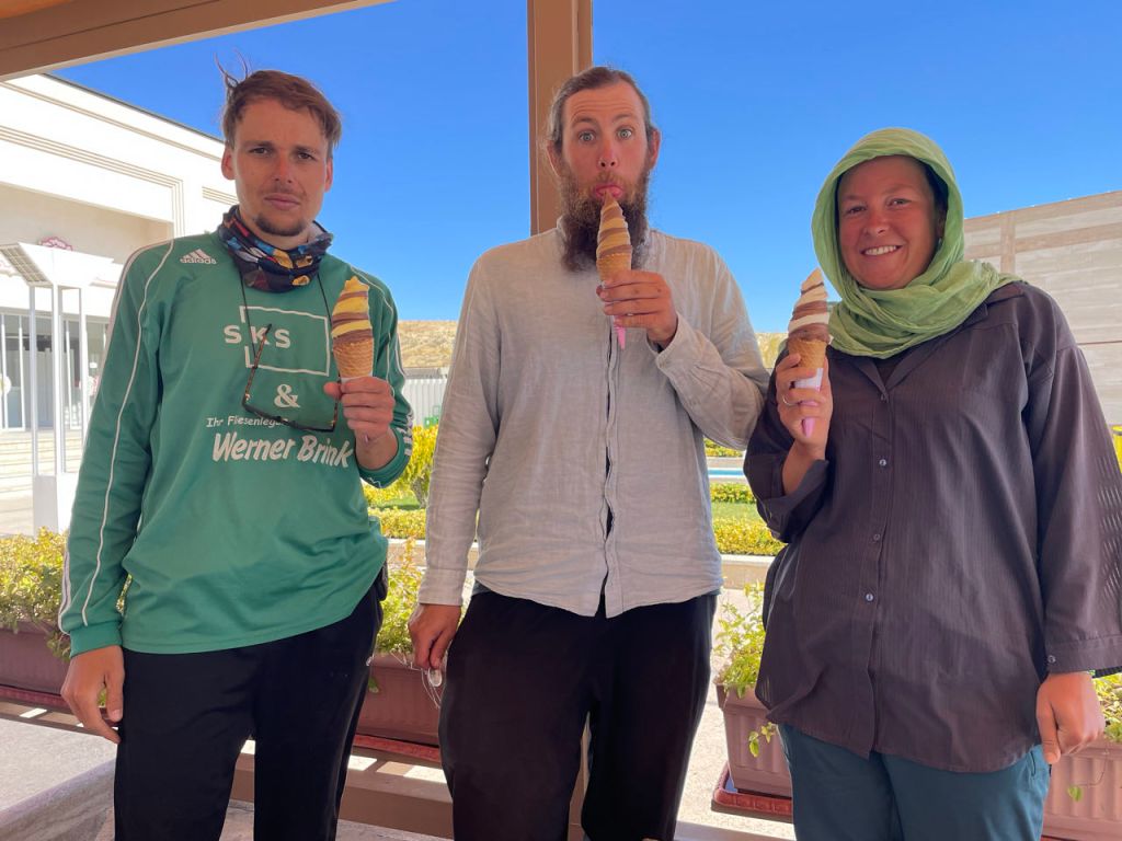 Am Mittwochmorgen war der Wind fast weg, aber Hannah fühlte sich überhaupt nicht gut und hatte wenig geschlafen. Daher war unser Ziel für heute vor allem, dass Hannah wieder gesund wird. Dafür fuhren wir um die 15 Kilometer bis zu einer Raststation, an der wir Vorräte und Cracker einkaufen konnten. Zum Glück ging es dorthin vor allem bergab. Wir anderen drei gönnten uns ein Eis von Mohammadi Ice Cream und ruhten dann erstmal ein paar Stunden am Picknickplatz dort.