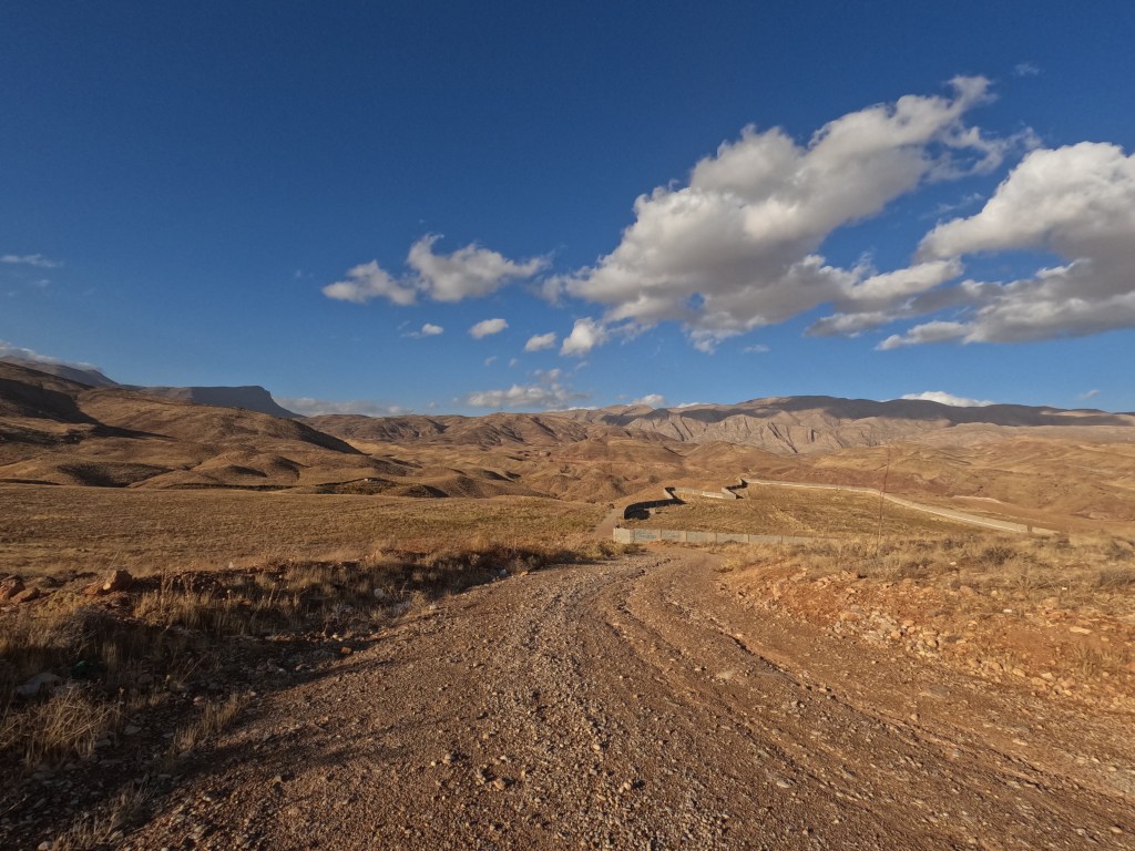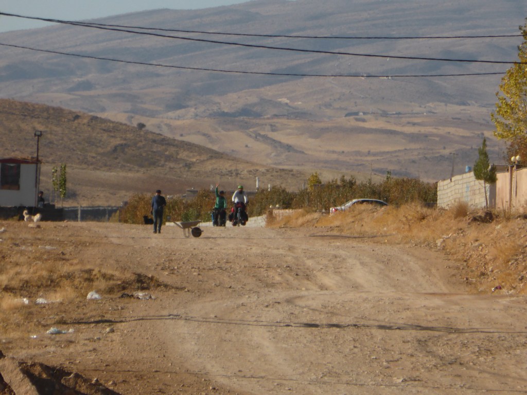 In der Nacht auf Donnerstag, den 23.11. musste Karin mal raus und der Tacho zeigte -0,8 Grad Celcius an. Als wir morgens aufwachten, waren wieder die Zelte mit Raureif überzogen und es fühlte sich immer noch zu kalt an, um aufzustehen. Maik schaffte es aber doch als erster raus und kochte schonmal Kaffee und Porridge. Die Zelte waren noch ziemlich nass, daher frühstückten wir erstmal gemütlich und da wurde es auch schon wärmer. Dann konnten wir losstarten und im nächsten Dorf Vorräte kaufen. Dort sahen wir Mathias, der noch eine Nacht länger im Hostel in Shiraz geblieben ist, gerade beim Bäcker anstehen und quatschten kurz mit ihm. Dann düste er schon davon. Heute standen für uns ca. 30 Kilometer annähernd flach und dann die restlichen Kilometer bergab mit 3-5% an. Kurz vor der langen Abfahrt machten wir noch eine Pause, wie so oft mit Tee, Brot, Käse, Gurken, Tomaten und Erdnussbutter. So hatten wir wieder Kraft für den letzten Anstieg und ab dann konnte die schöne Abfahrt beginnen. Wir hatten selten so eine schöne Aussicht bei einer Abfahrt und es machte richtig Spaß, zu viert so hinunterzufahren…