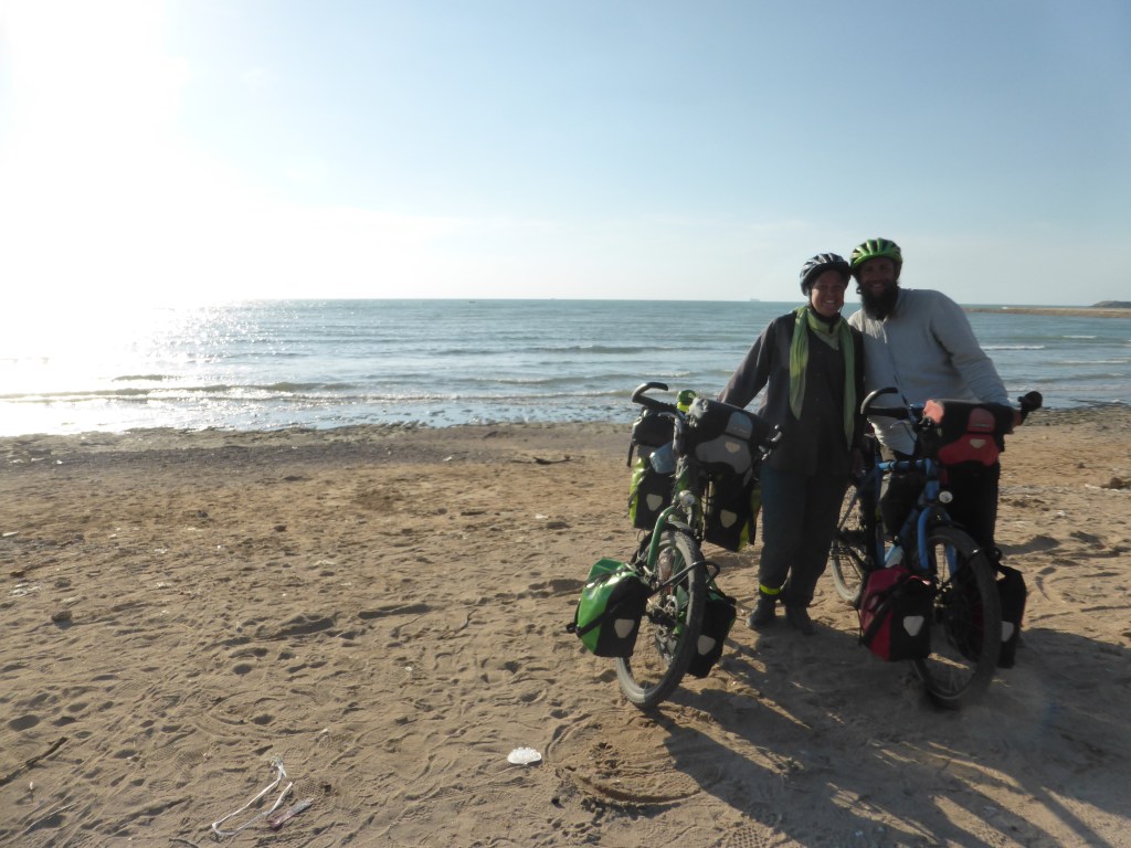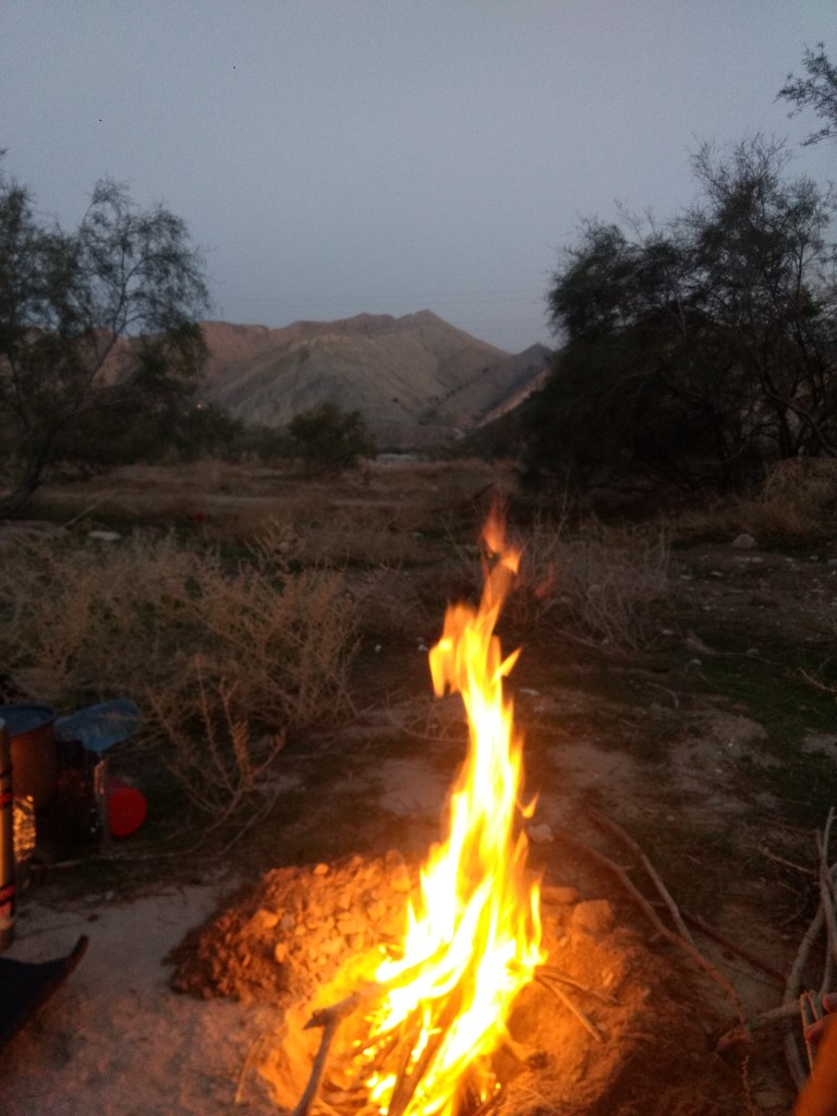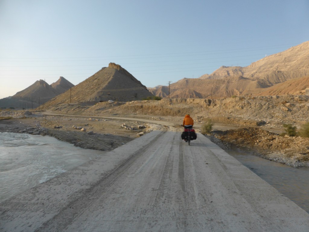 Am Samstag, den 25.11. klingelten unsere Wecker schon kurz vor sechs Uhr, denn wir hatten uns so vage vorgenommen, heute um die 96 Kilometer bis nach Bushehr ans Meer zu radeln. Kurz nach sechs Uhr wurde es auch hell und Maik war schon am Kocher zu hören. Unsere Zelte, Schlafsäcke und Isomatten waren zwar feucht, aber wir packten alles ein, um alles später zu trocknen. Nach dem Frühstück waren wir schon um kurz vor acht Uhr auf den Fahrrädern und radelten einen der letzten Hügel hinauf. Ab halb neun ging es dann für heute (und die nächsten Tage) nur noch flach oder bergab, wouhouu!