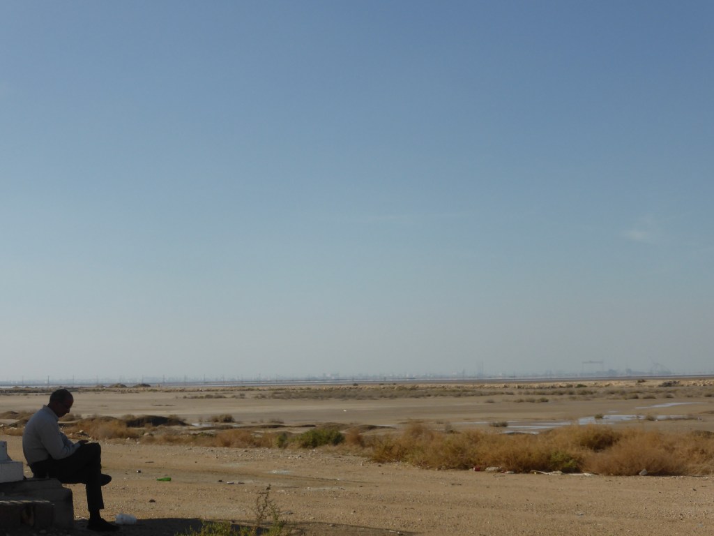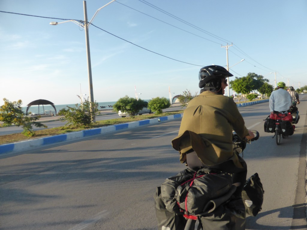 Zwischendurch hielt uns ein Mann an und schenkte uns Safranbrot und Kakis und freute sich, uns zu sehen. Wir fuhren heute fast die ganze Zeit über 20 km/h, wir wollten ja gerne ankommen und es war ja flach, also konnten wir gut fahren. Nach 45 Kilometer machten wir mitten in einem Dorf an der Straße Pause und waren die Hauptattraktion. Viele Menschen allen Alters schauten uns an, grüßten uns oder fuhren extra noch ne Runde mit dem Fahrrad oder Moped an uns vorbei. Dann fuhren wir weiter durch das platte Landund freuten uns, dem Meer immer näher zu kommen. In Buschehr war Mathias schon dabei, eine gute Bleibe für uns zu organisieren, denn er hatte uns unterwegs seit Shiraz überholt. In Bushehr ging es erst noch eine Weile geradeaus, vorbei am Flughafen und geradewegs zum Meer.