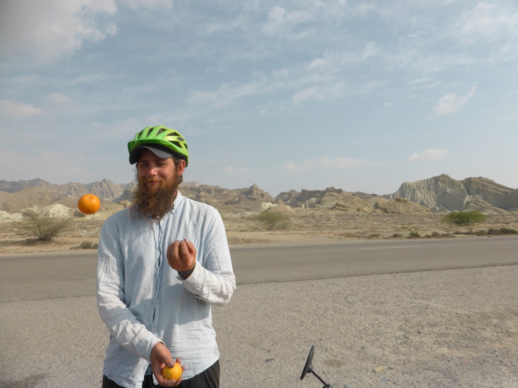 Wir wachten am Mittwoch, dem 13. Dezember 2023 mit einem schönen Sonnenaufgang auf, frühstückten, schoben die Räder durch die Dünen zurück zur Straße und fuhren weiter Pakistan entgegen. Nach etwa 25 Kilometern hörte und spürte Simon ein Knacken in seiner Fahrradkette. Wir wussten nicht genau, wo es herkam, untersuchten also erstmal die Kette genau. Wir sahen, dass der Bolzen, mit dem man die Kette wieder verbindet, herausgerutscht war. Simon baute schnell ein neues Quicklink ein. Als wir da so am Straßenrand standen und reparierten, hielt ein Autofahrer an und fragte in gutem Englisch, ob wir Hilfe bräuchten. Wir verneinten, aber er war ziemlich freundlich und bot uns an, zu ihm nach Hause zu kommen. Er lebt in Sirik, einer Stadt, die noch 15 Kilometer entfernt war, aber auf unserem Weg lag. Er bot uns auch an, bei ihm zu duschen, Wäsche zu waschen und bei ihm zu übernachten. Er, Ali, gab uns seine Nummer auf einem Stück Papier. Wir haben ja keine funktionierende SIM-Karte im Iran mehr, da man hier jeden SIM-Slot im Telefon nur 30 Tage nutzen kann. Er meinte, wir sollen jemanden nach einem Handy fragen und ihn anrufen, wenn wir in Sirik sind. Das taten wir auch genauso. Wir waren zufällig nur 100 Meter vom Haus von ihm und seiner Frau weg, also kam er schon gleich zu uns und wir gingen erstmal in ein kleines Restaurant zum Mittagessen. Er erzählte uns, dass er in Malaysia studiert hat und dass er aus einem Dorf nebenan kommt und deshalb viele Menschen in Sirik kennt und mit einigen verwandt ist. Das ist super, wenn man mal etwas braucht, dann hilft man sich gegenseitig. Wir durften unser Mittagessen natürlich nicht bezahlen. Und dann durfte/sollte Simon noch gekühlte Getränke im Laden aussuchen. Er fragte zweimal, ob er Simon zum Barbier einladen könne, aber wir sind zufrieden mit Simons Bart 🙂