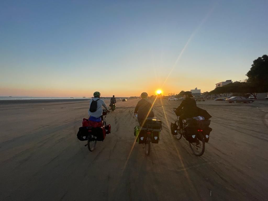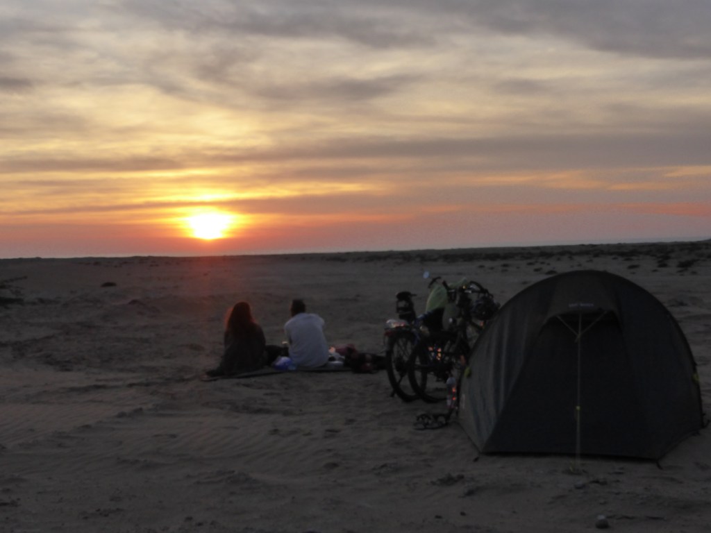 Ein Fahrer schenkte uns einen wunderschönen Granatapfel. Zum Glück waren es nur wenige Kilometer Huckelpiste, bis wir wieder zur großen Straße kamen. Dort an einer ziemlich leeren Tankstelle genossen wir den zweiten Teil unserer Mittagspause im Schatten ohne Ziegen. Später liefen noch zweimal Kamele vor uns über die Straße, die von den Autos angehupt wurden. Gegen 15:30 waren wir wieder fast am Meer. Wir bogen in ein trockenes Flussbett, das auch teilweise als Weg genutzt wird, ein und bahnten uns einen Weg eine Düne hoch, wo wir den wunderschönen Sonnenuntergang über dem Meer beobachten konnten und uns dachten: Mensch, haben wir es gut!