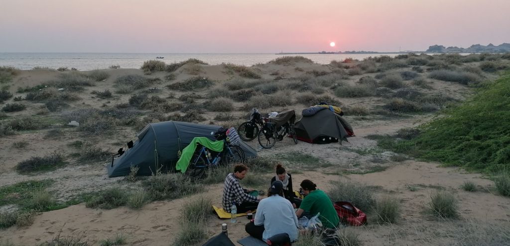 Als wir alles zusammen hatten, wurde noch Brot gekauft – es muss erwähnt werden, da der Brotkauf bei den besseren Bäckern nicht selten mit 30 Minuten Anstehen verbunden ist. Und dann ging es los in die Nähe des Fährhafens, um unterwegs nach einem geeigneten Ort zum Zelten zu suchen. Wir fanden kurz vor dem Hafen einen vergleichsweise ruhigen Park (Ende einer Sackgasse, wenig Licht und relativ wenige Jungs mit lauten Mopeds). Dort kochten und aßen wir erstmal, um nach Einbruch der Dunkelheit unsere Zelte aufzubauen. Wir hatten einen sehr schönen letzten Abend gemeinsam, wobei der letzte Abend auf Hormuz eigentlich schon der Abschiedsabend war. Es gab Lagerfeuer, Musik und viel Zeit, die gemeinsamen 1900 Kilometer Revue passieren zu lassen.