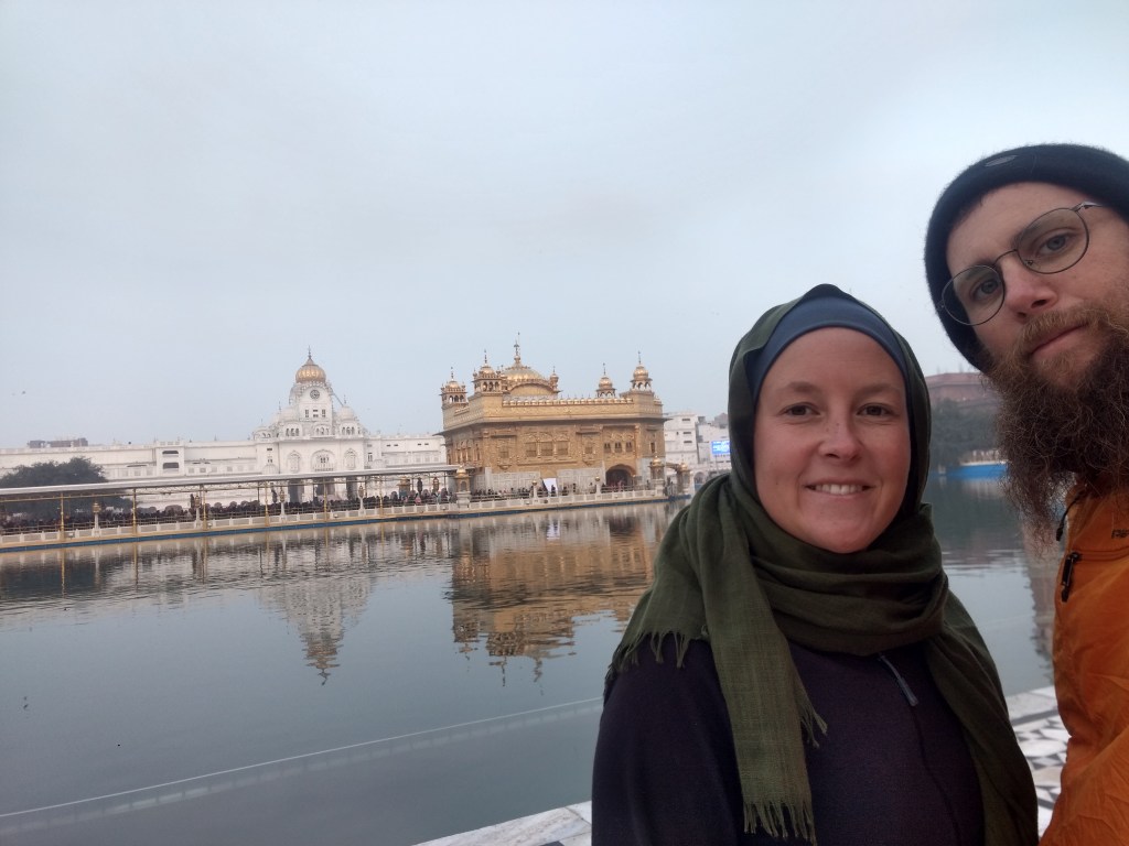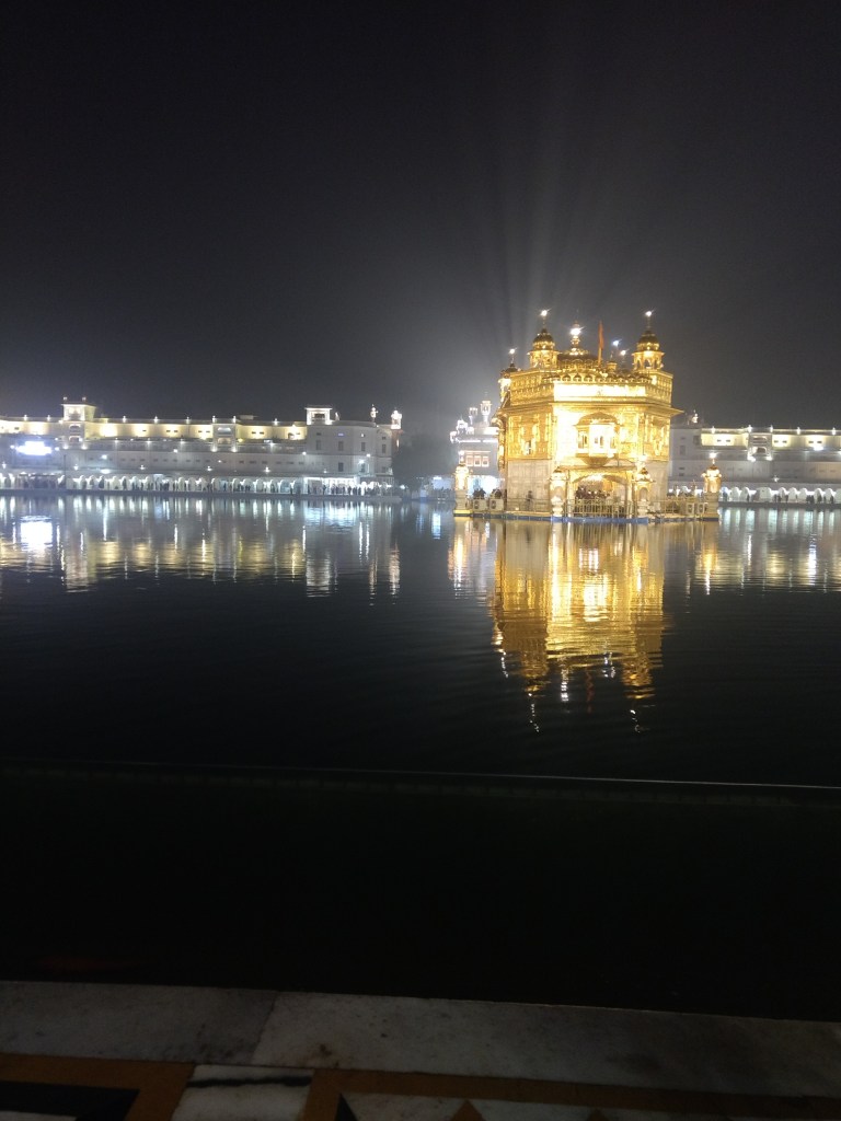 Wir kamen dort also mit unseren Fahrrädern an und durften vier Betten in einem Zimmer im Teil für die internationalen Reisenden beziehen. Danach wollten wir uns den goldenen Tempel ansehen. Schuhe sind dort nicht erlaubt, also gingen wir barfuß um den goldenen Tempel, der inmitten eines großen Teichs, in dem heiliges Wasser ist, steht.